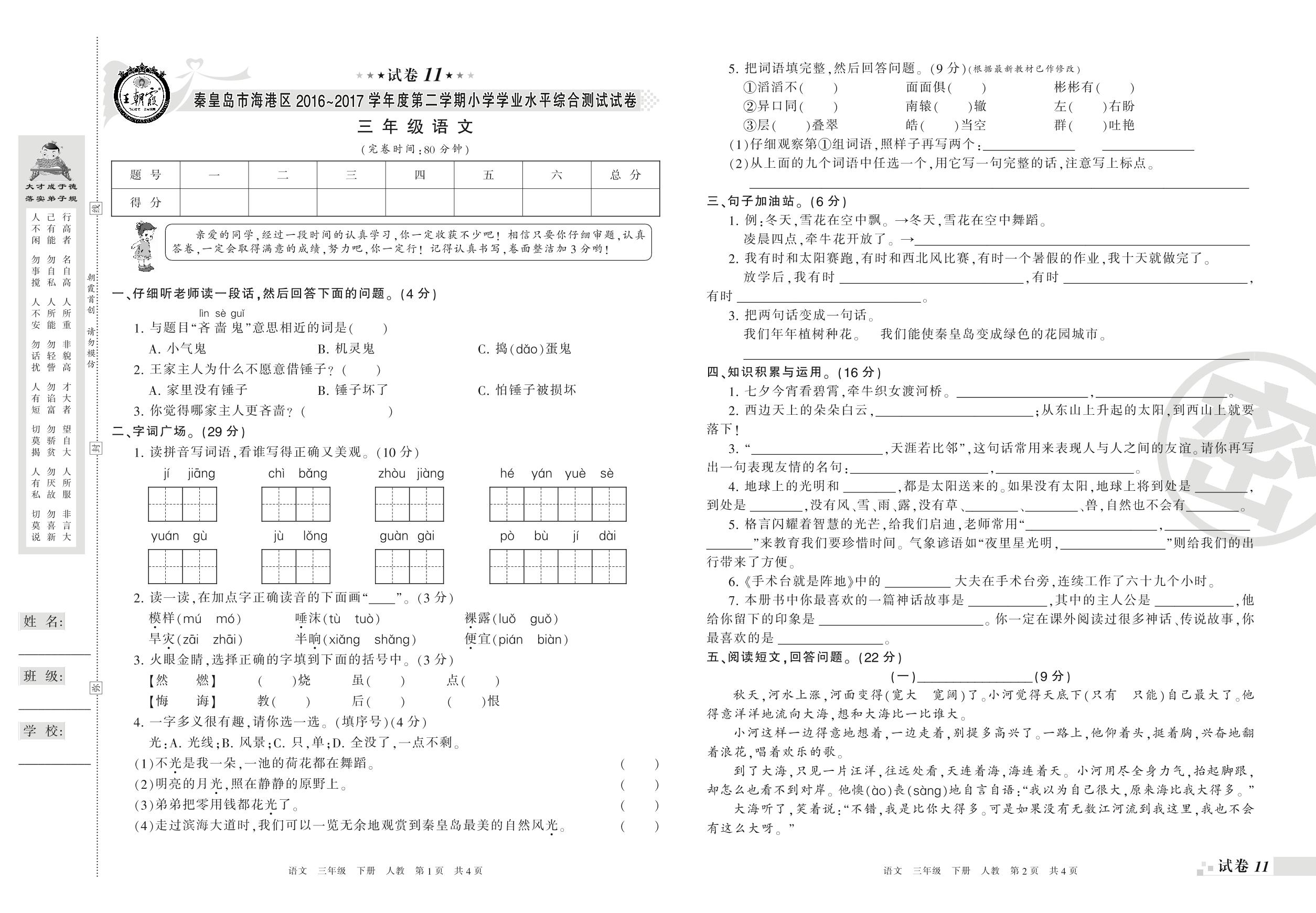 2016-2017学年第二学期秦皇岛市海港区三年级语文试卷(人教版)【11】
