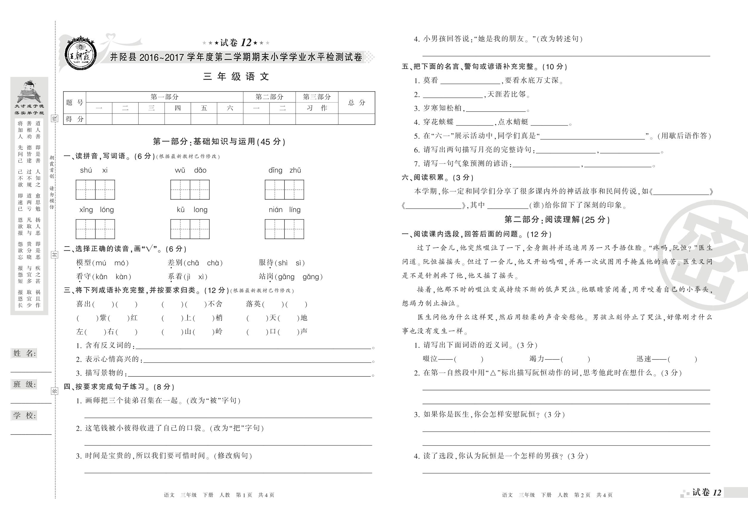 2016-2017学年第二学期石家庄市井陉县三年级语文试卷(人教版)【12】