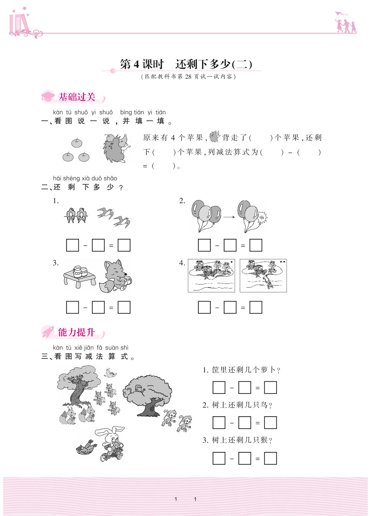 2020上册一年级数学北师版 三 加与减(一)——第4课时 还剩下多少(二)