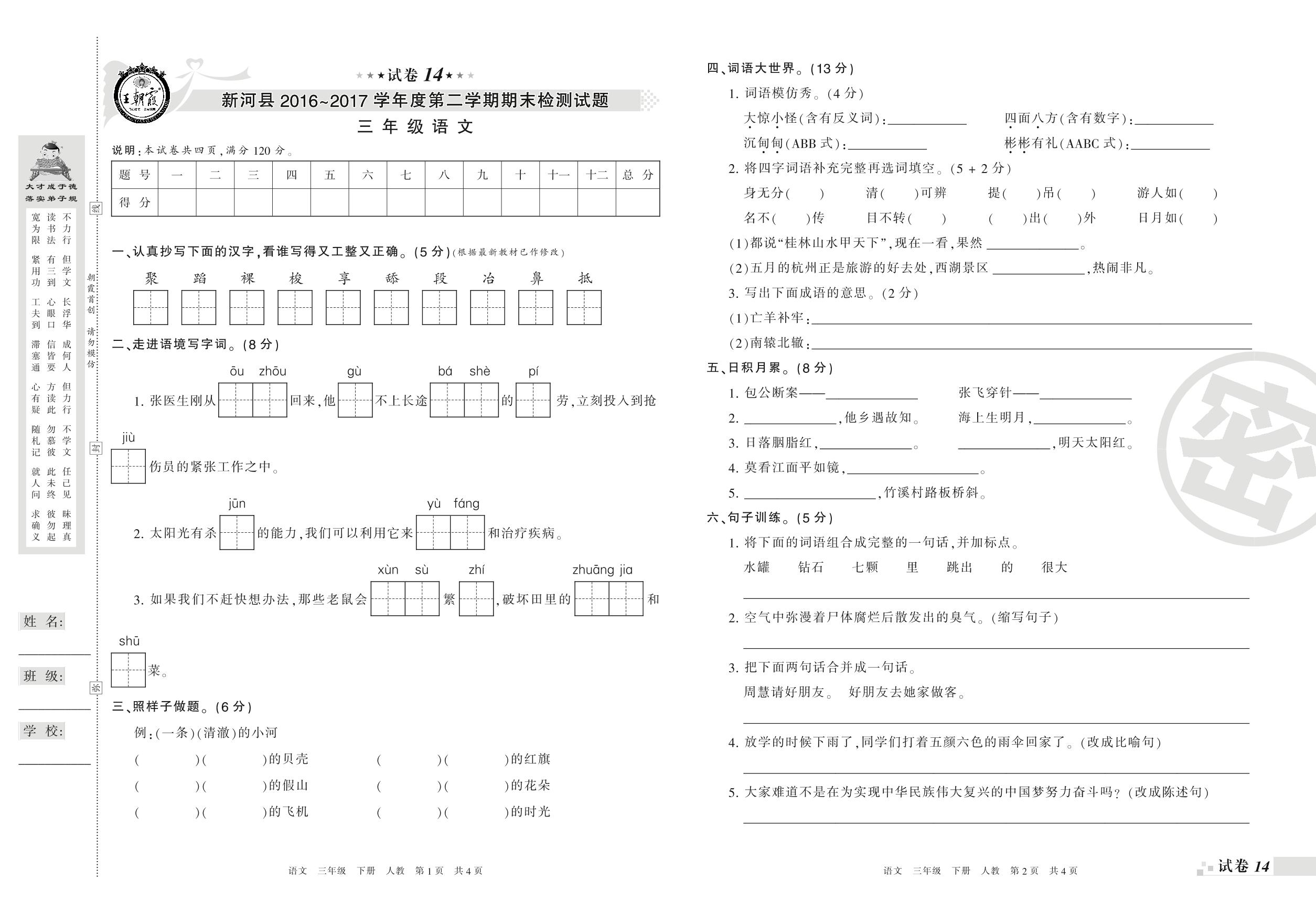 2016-2017学年第二学期邢台市新河县三年级语文试卷(人教版)【14】