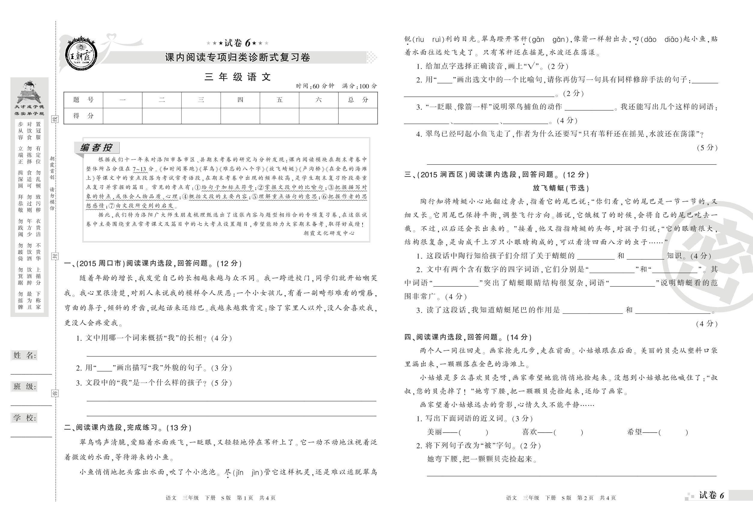 王朝霞期末专项卷——课内阅读专项归类诊断式复习卷三年级下册语文(S版)_R210801105431【6】