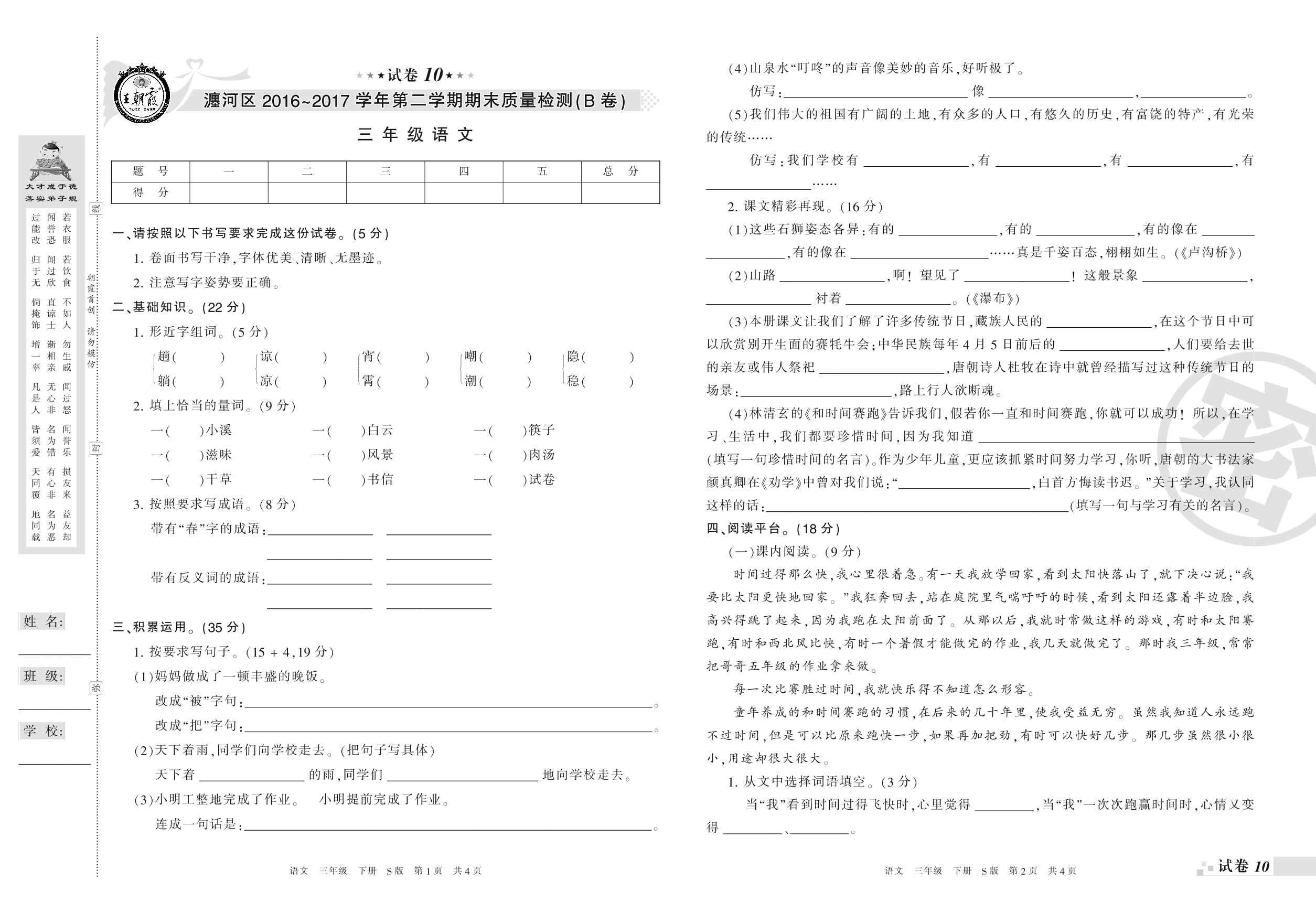 2016-2017学年第二学期洛阳市瀍河区三年级语文试卷(S版)【10】