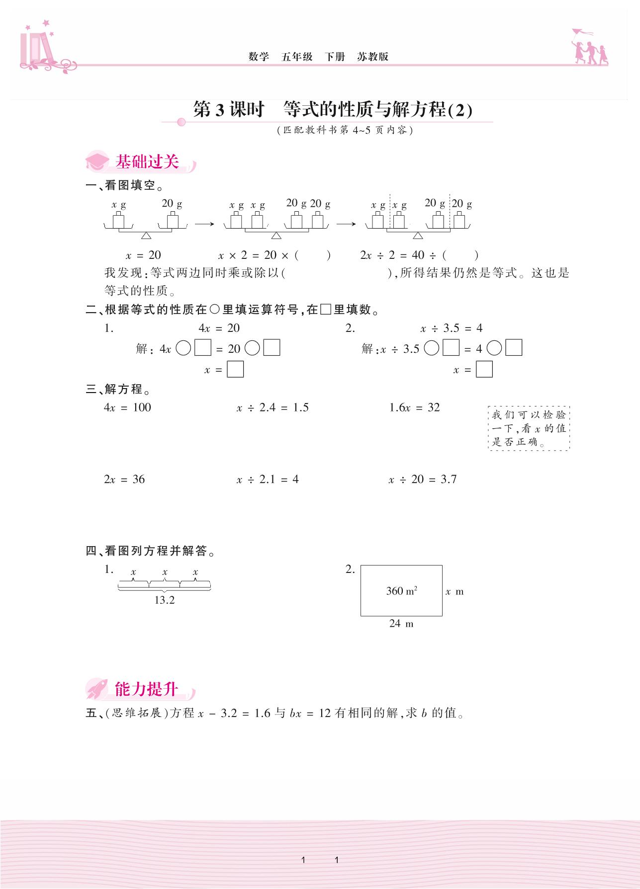 2021下册五年级数学苏教版 一 简易方程——第3课时 等式的性质与解方程(2)
