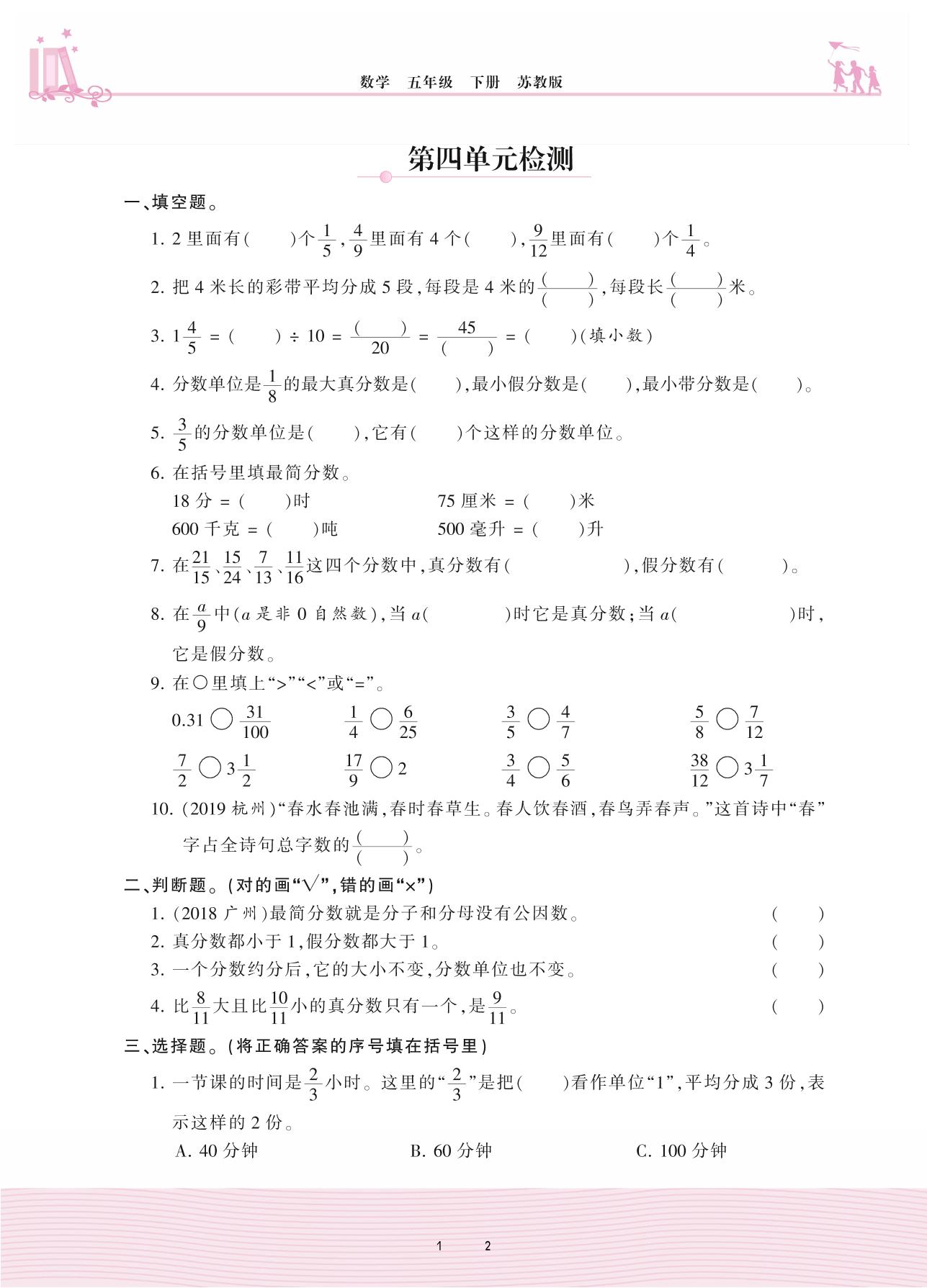 2021下册五年级数学苏教版 四 分数的意义和性质——第四单元检测