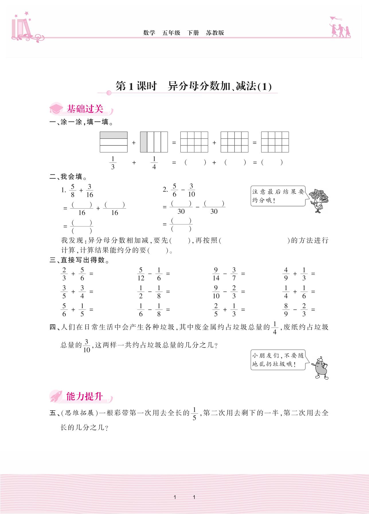2021下册五年级数学苏教版 五 分数加法和减法——第1课时 异分母分数加、减法(1)