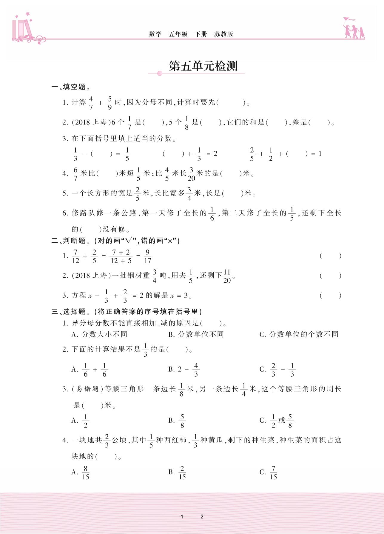 2021下册五年级数学苏教版 五 分数加法和减法——第五单元检测