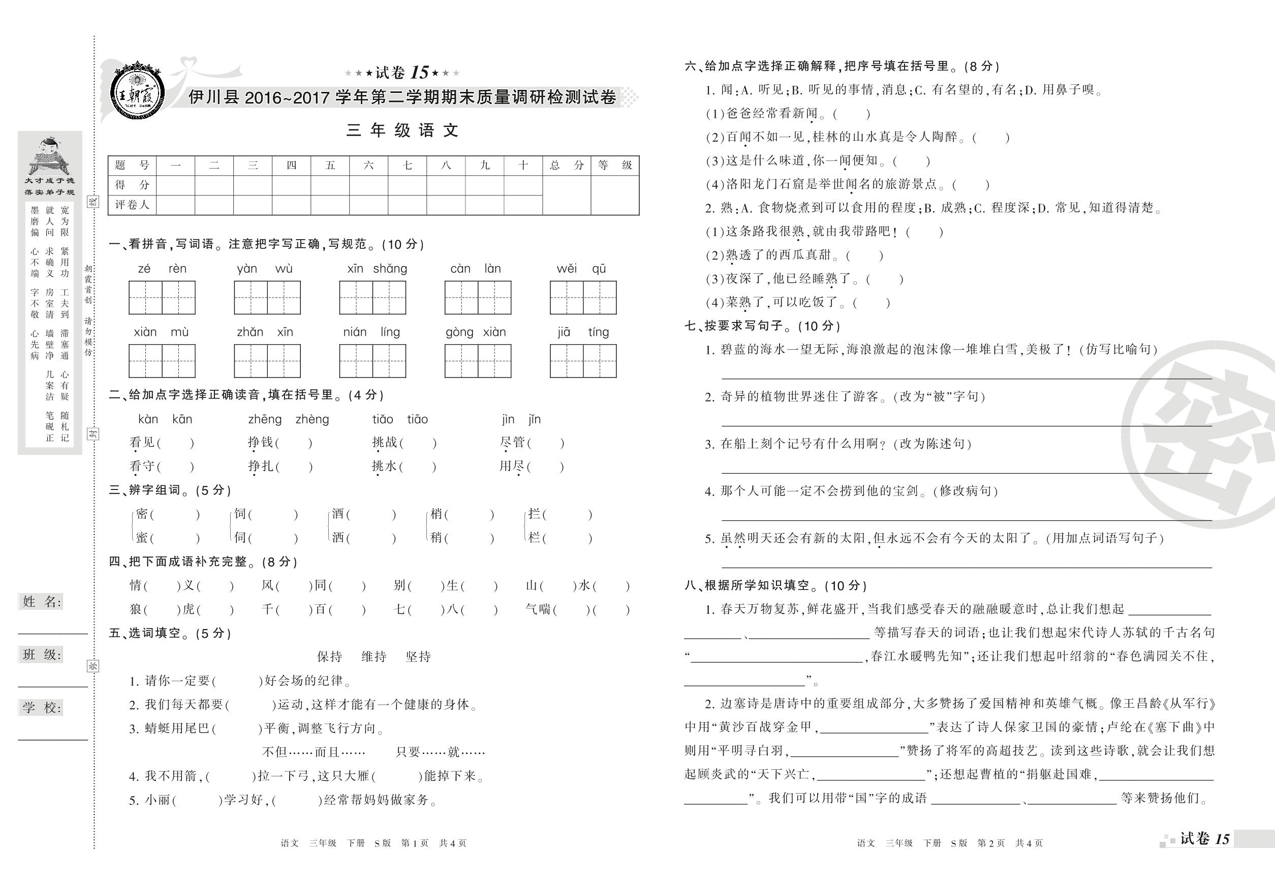 2016-2017学年第二学期洛阳市伊川县三年级语文试卷(S版)【15】