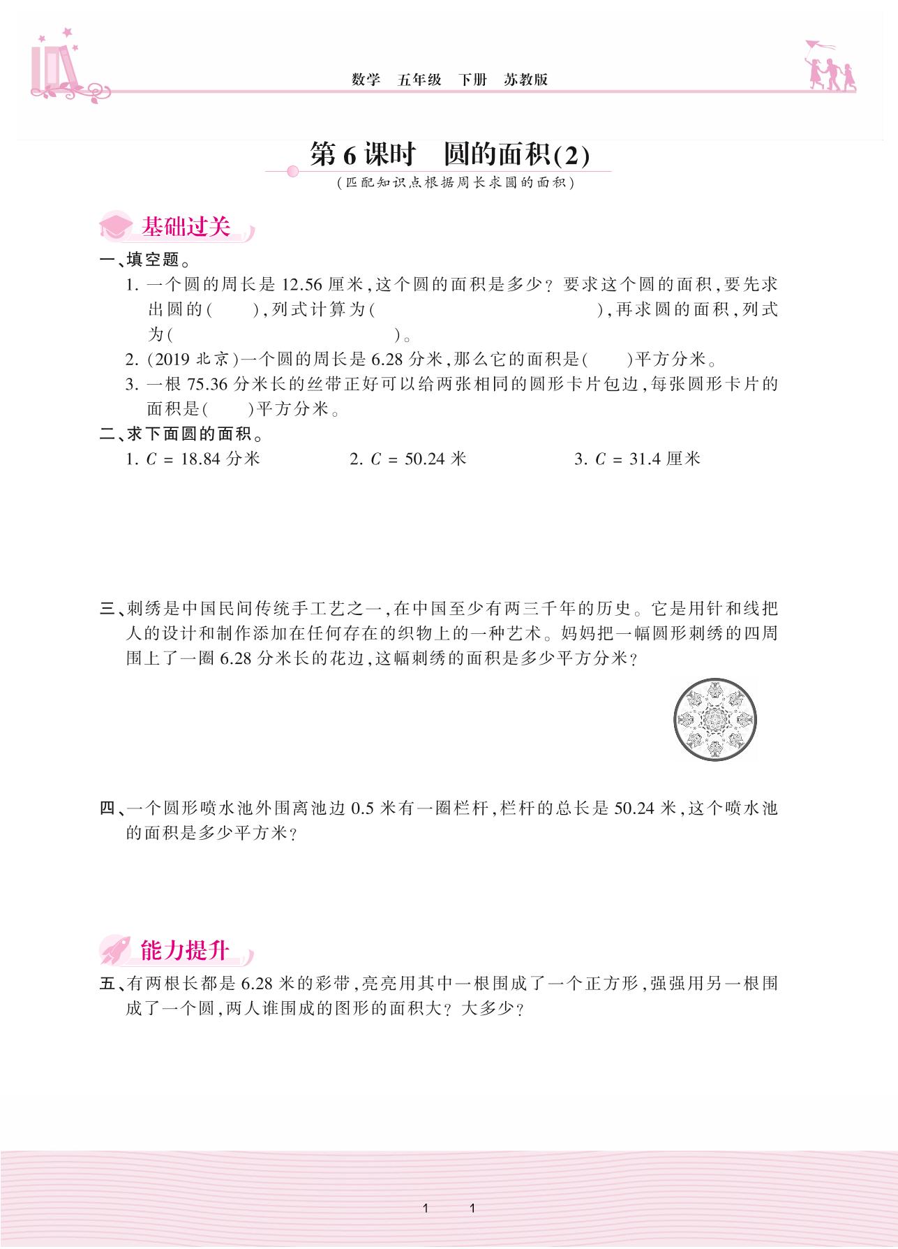 2021下册五年级数学苏教版 六 圆——第6课时 圆的面积(2)
