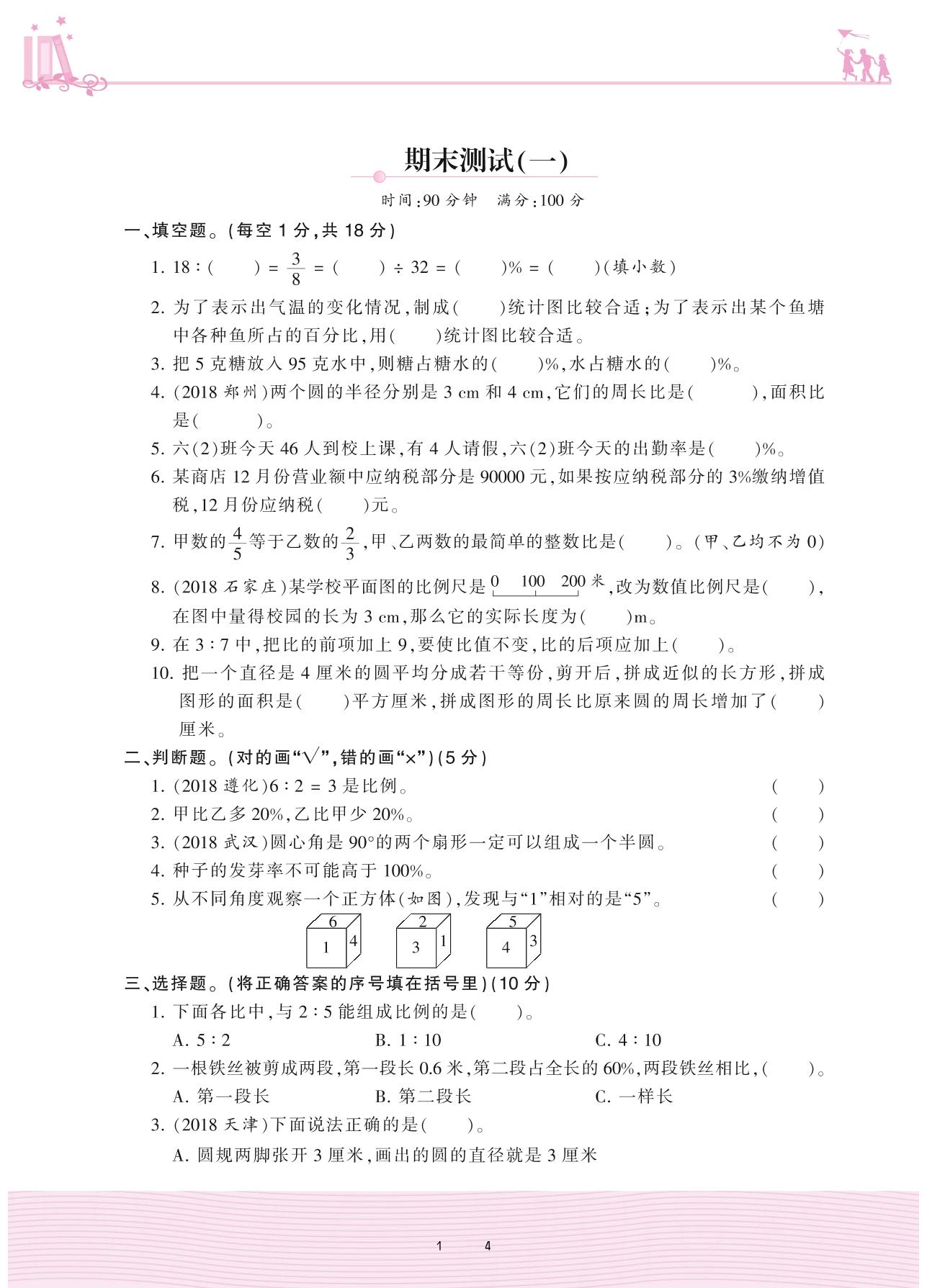 2020上册六年级数学冀教版 期末测试(一)