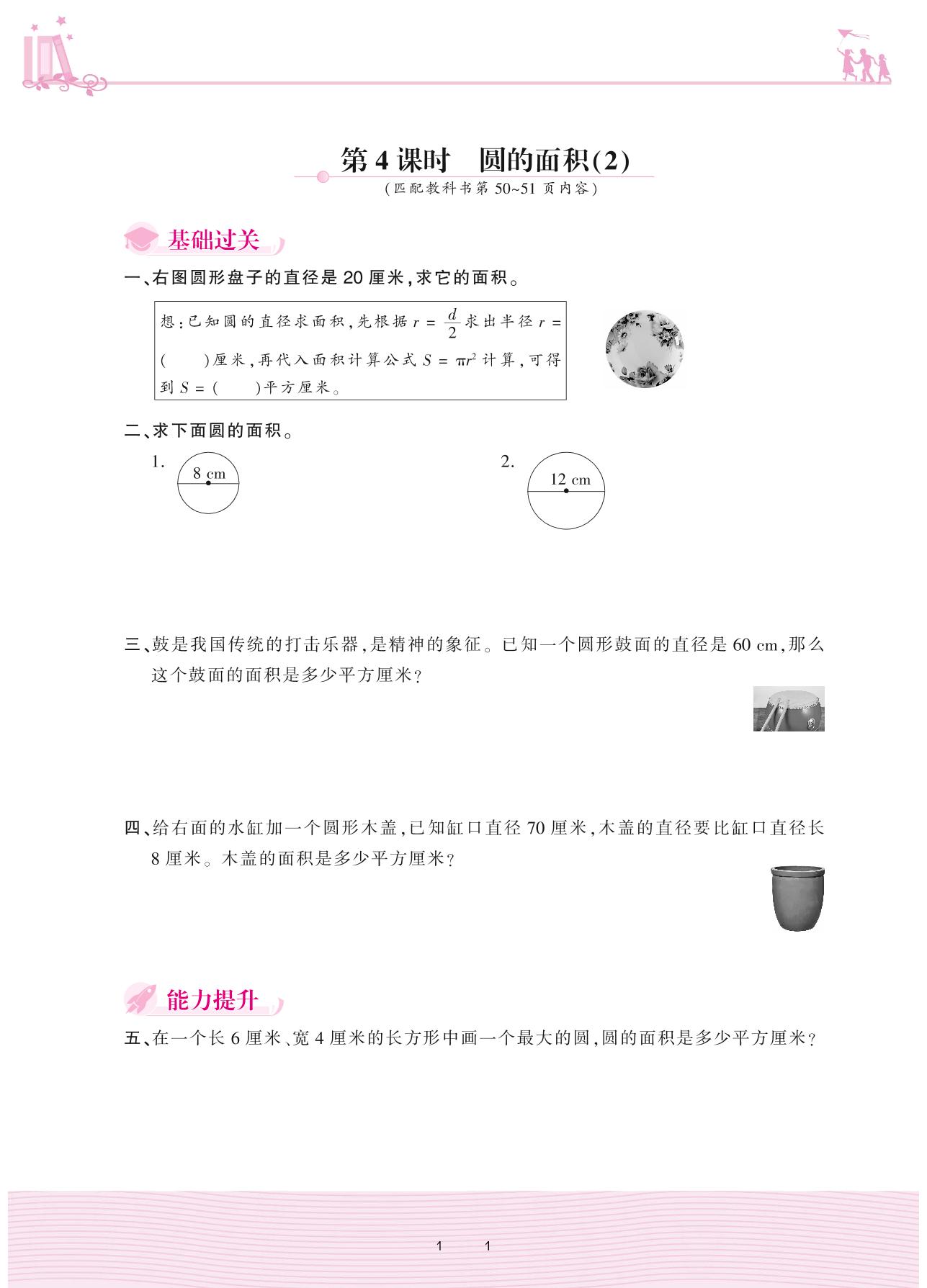 2020上册六年级数学冀教版 四 圆的周长和面积——第4课时 圆的面积(2)