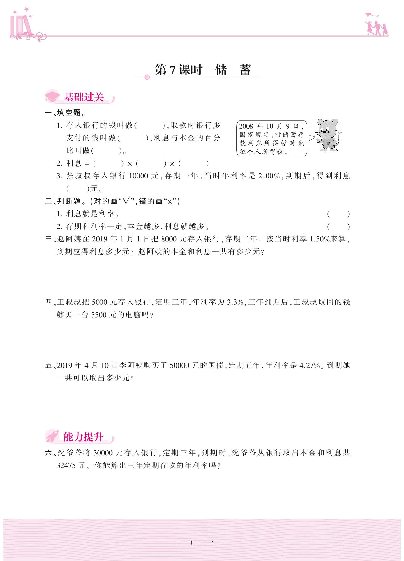 2020上册六年级数学冀教版 五 百分数的应用——第7课时 储蓄