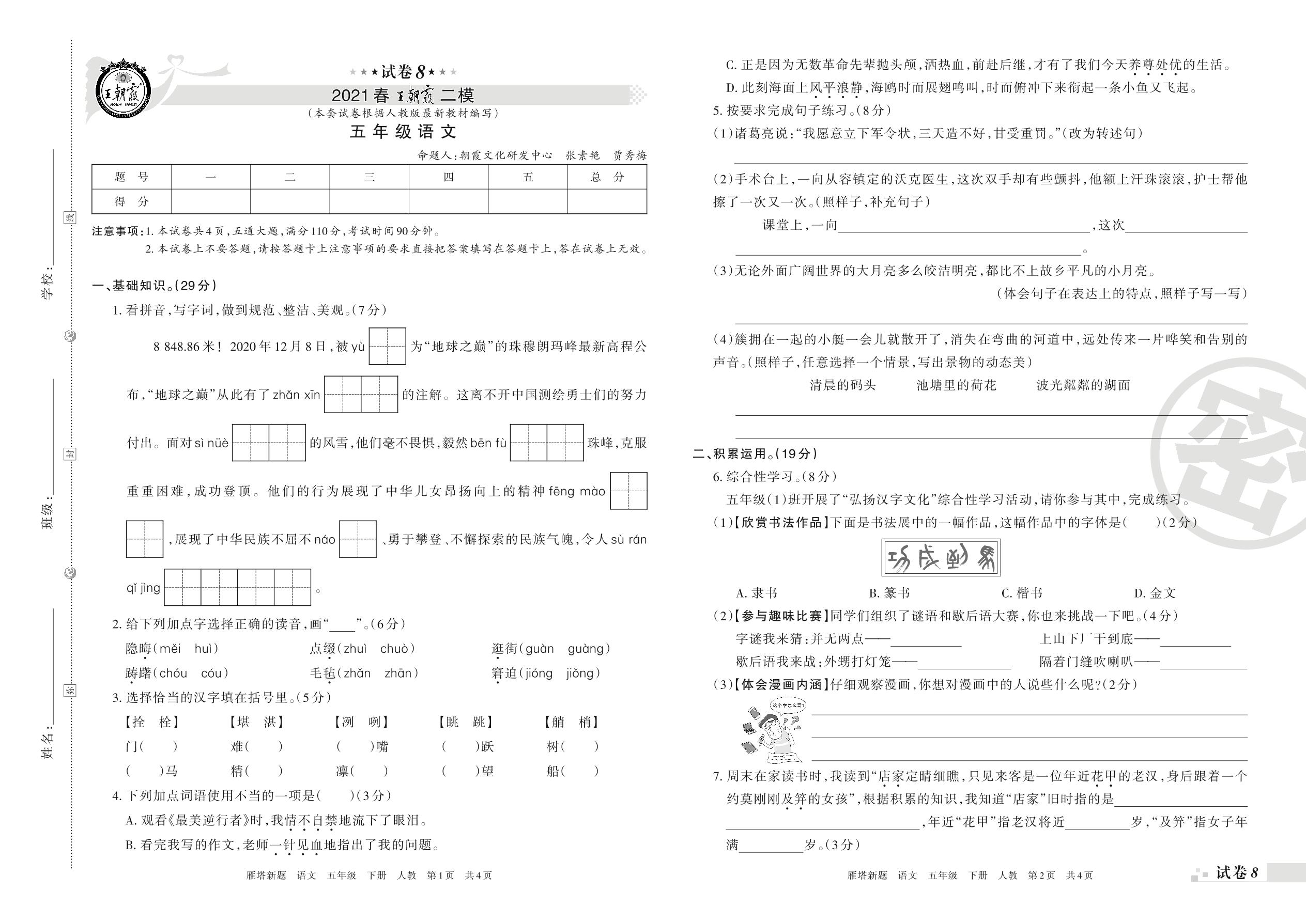 王朝霞期末模拟卷五年级下册语文(人教版)_R210801180658【8】