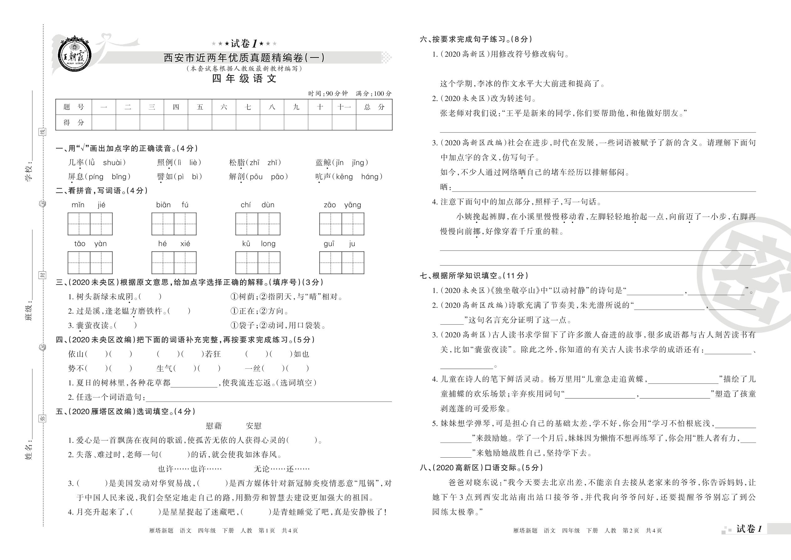 优质试题精编卷(一)四年级下册语文(人教版)【1】