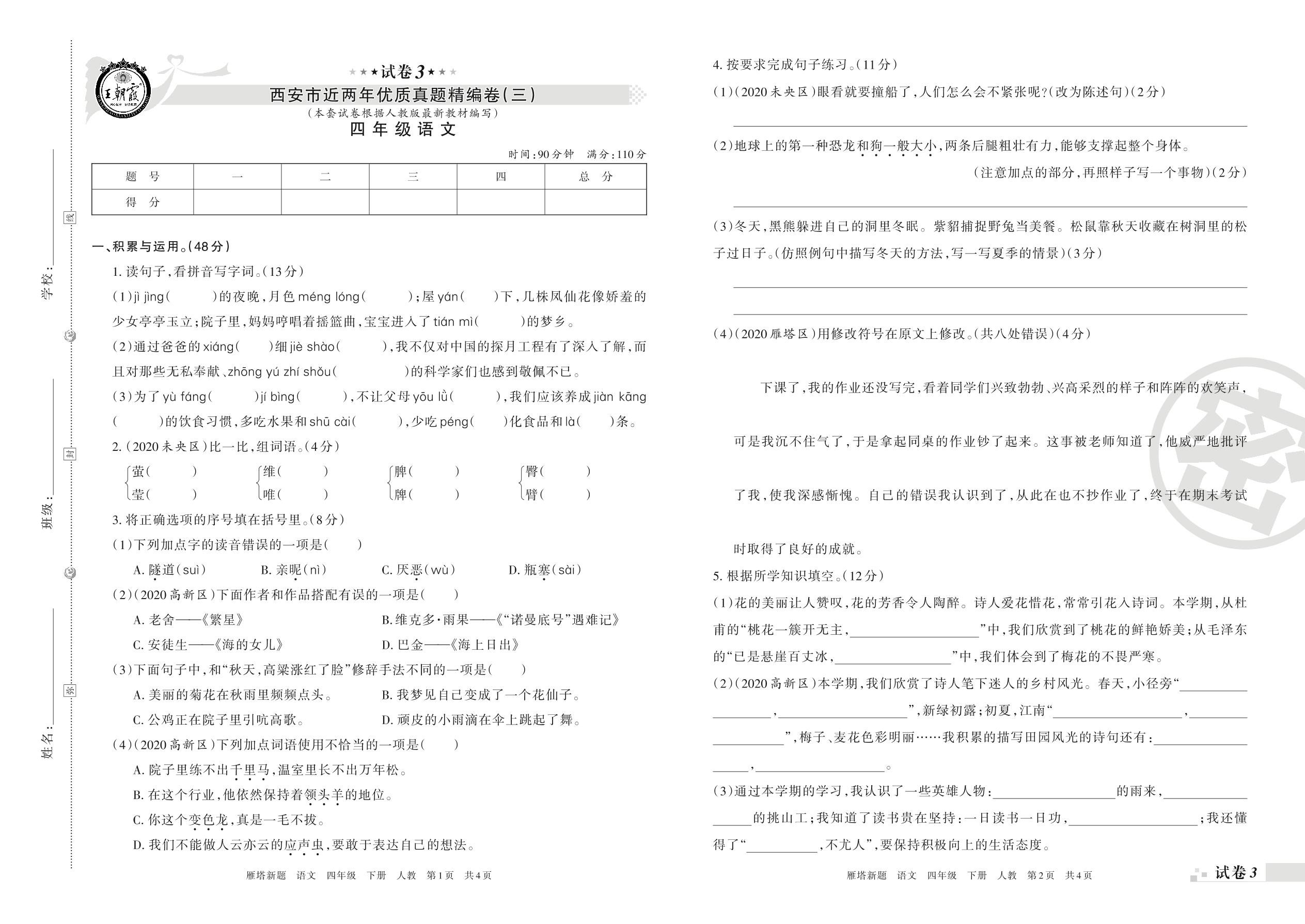 优质试题精编卷(三)四年级下册语文(人教版)【3】