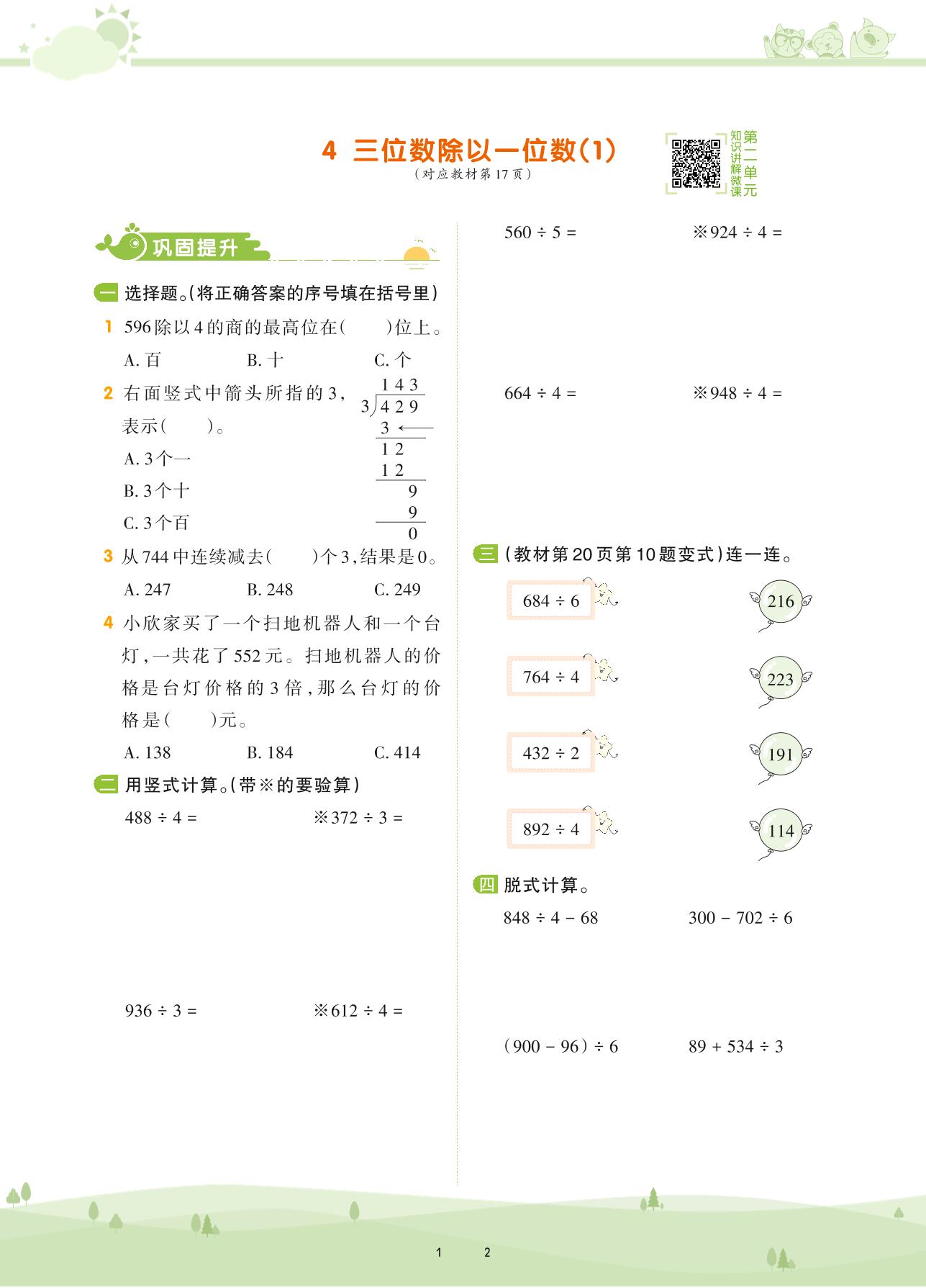 2021下册三年级数学人教版 第二单元 除数是一位数的除法——4 三位数除以一位数(1)