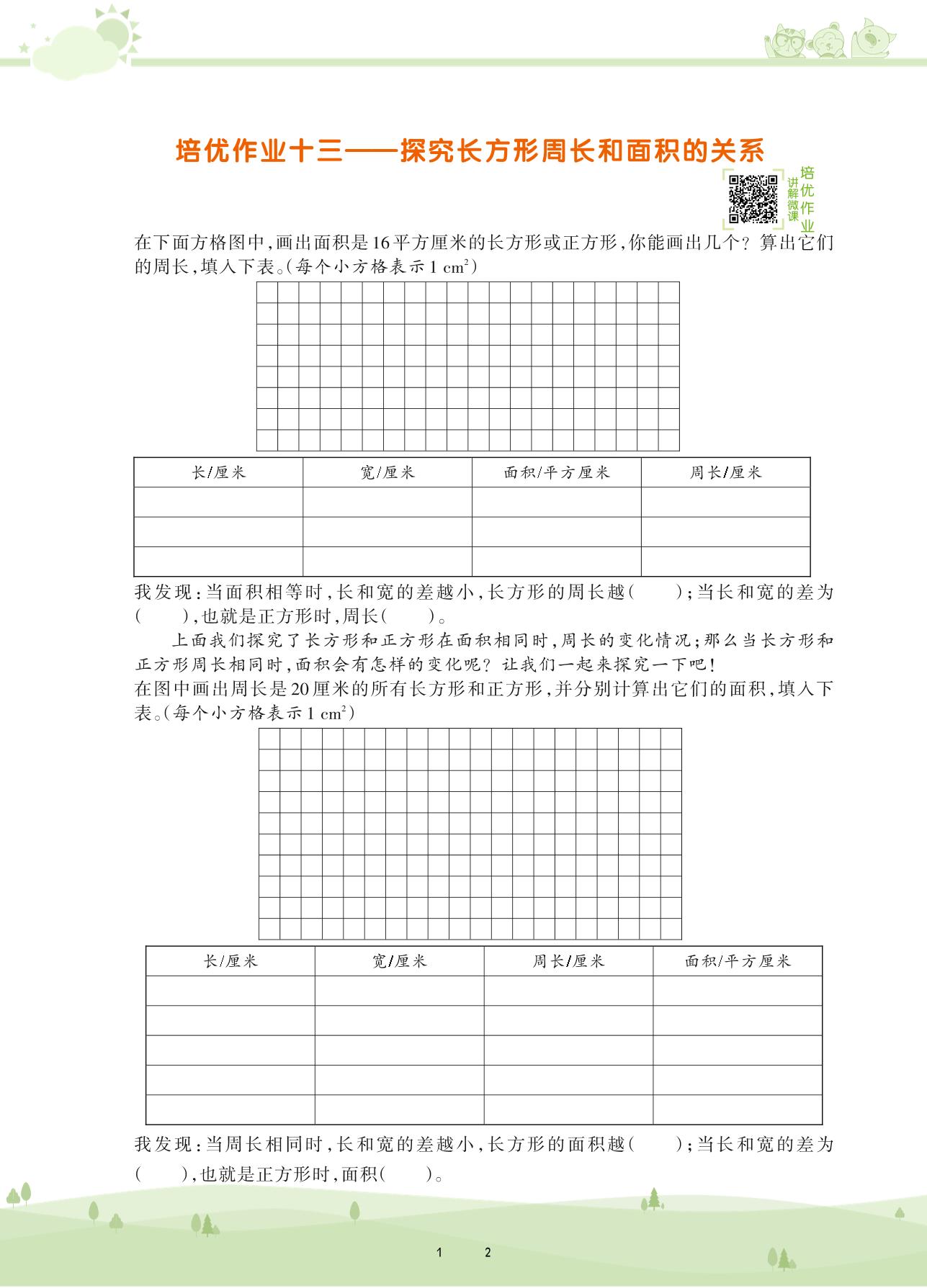 2021下册三年级数学人教版 第五单元 面 积——培优作业十三 探究长方形周长和面积的关系