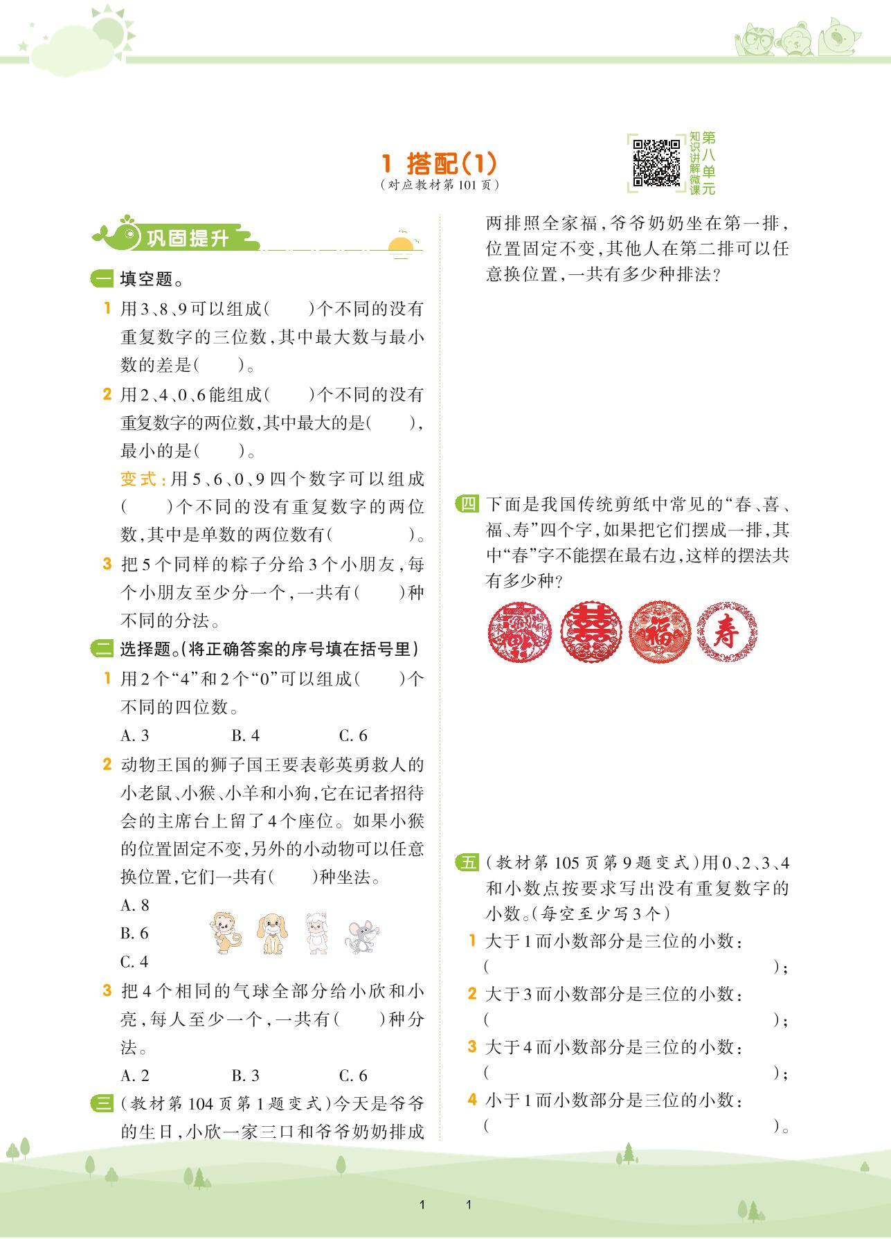 2021下册三年级数学人教版 第八单元 数学广角——搭配(二)——1 搭配(1)