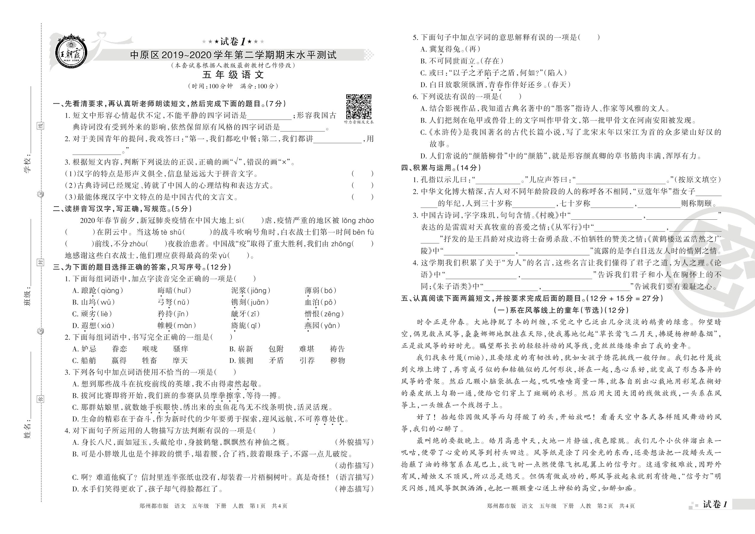 2019-2020学年第二学期郑州市中原区五年级语文试卷(人教版)_R210801180819【1】