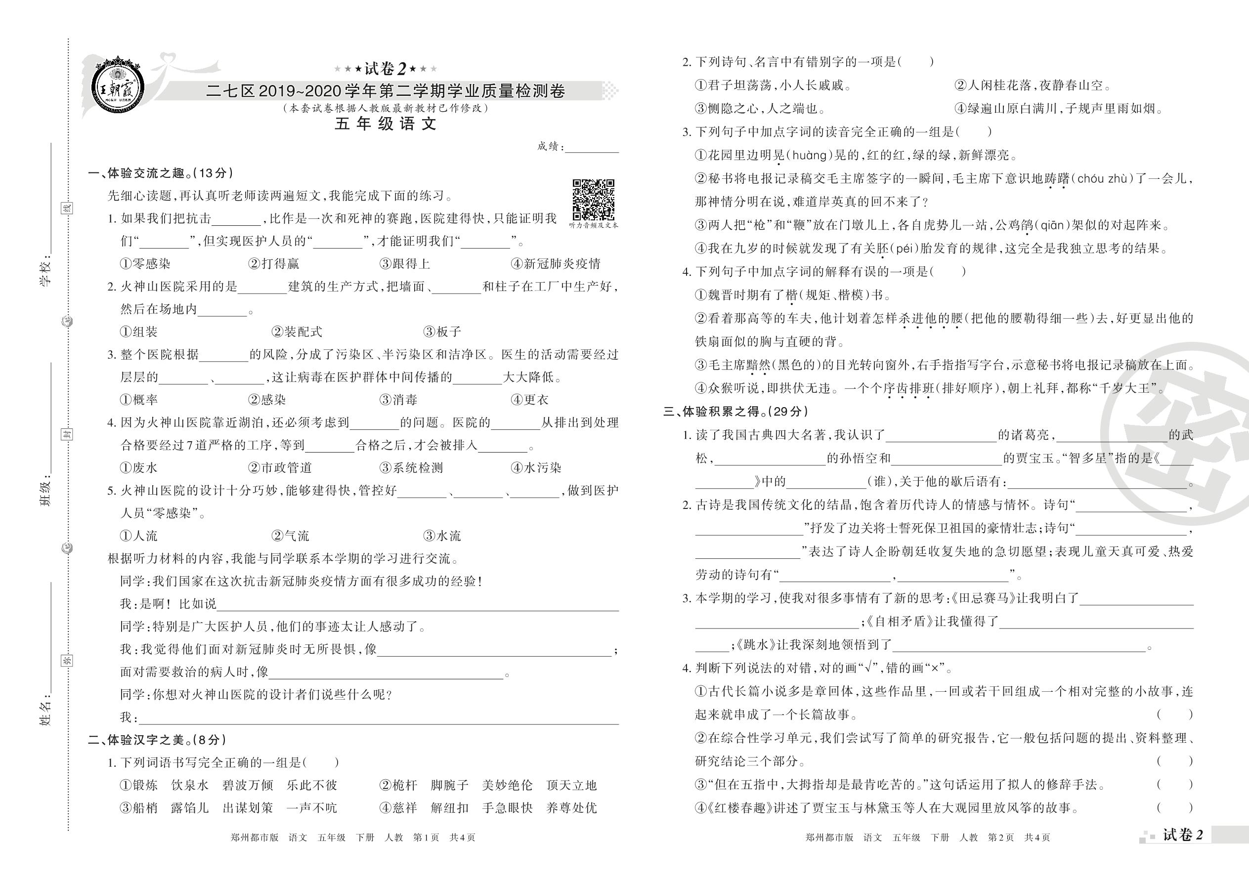 2019-2020学年第二学期郑州市二七区五年级语文试卷(人教版)【2】