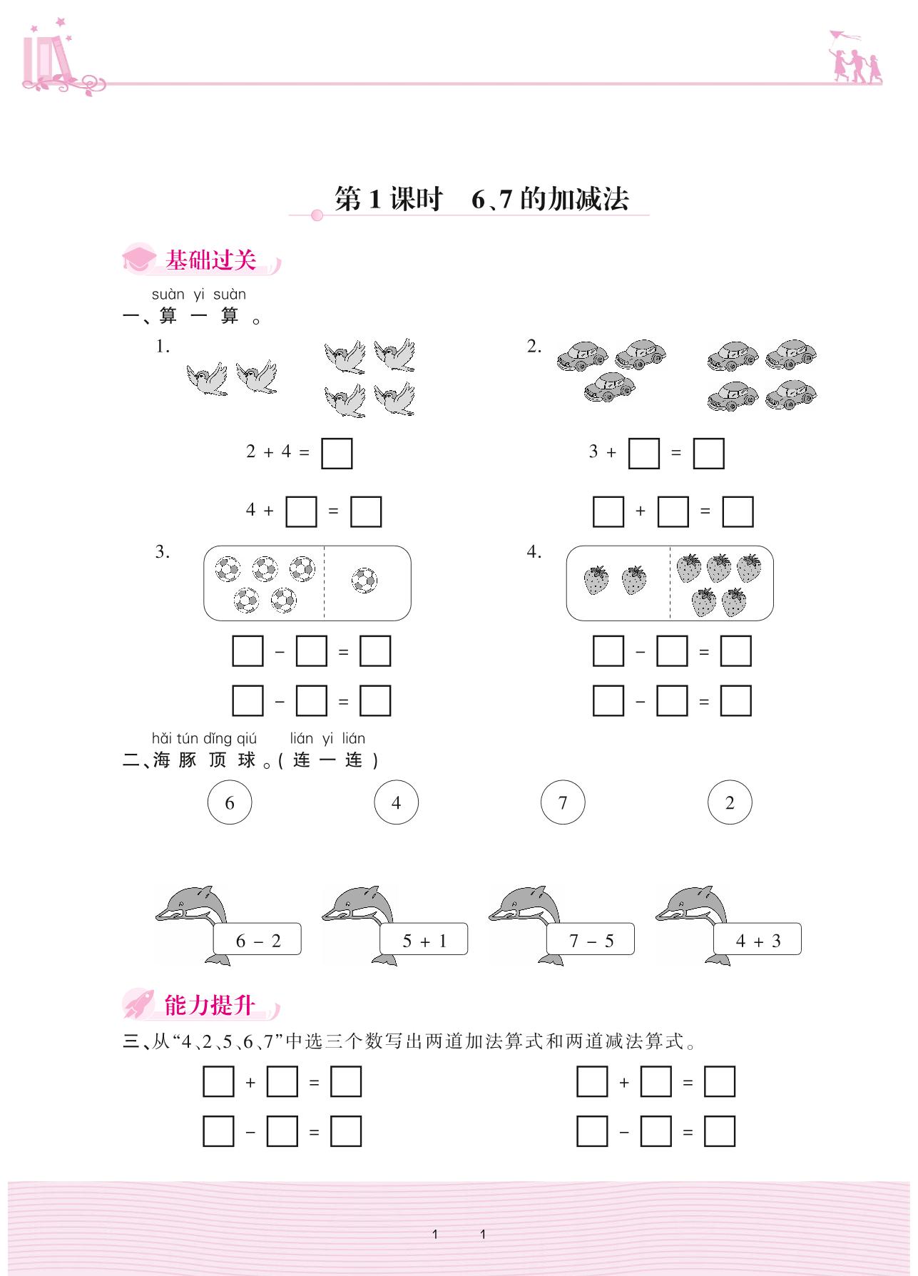 2020上册一年级数学冀教版 五 10以内的加法和减法 2. 6~10的加减法——第1课时 6、7的加减法