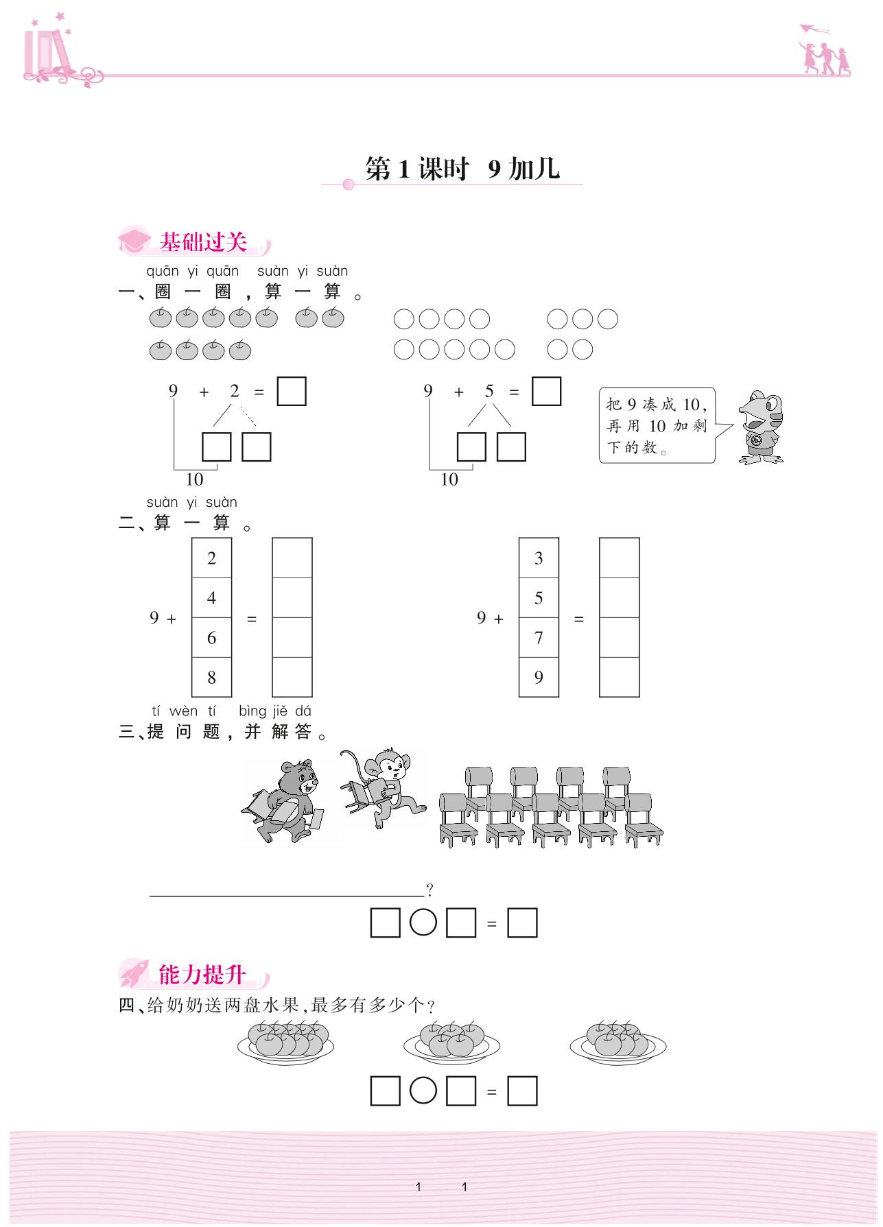 2020上册一年级数学冀教版 八 20以内的加法 2. 进位加法——第1课时 9加几