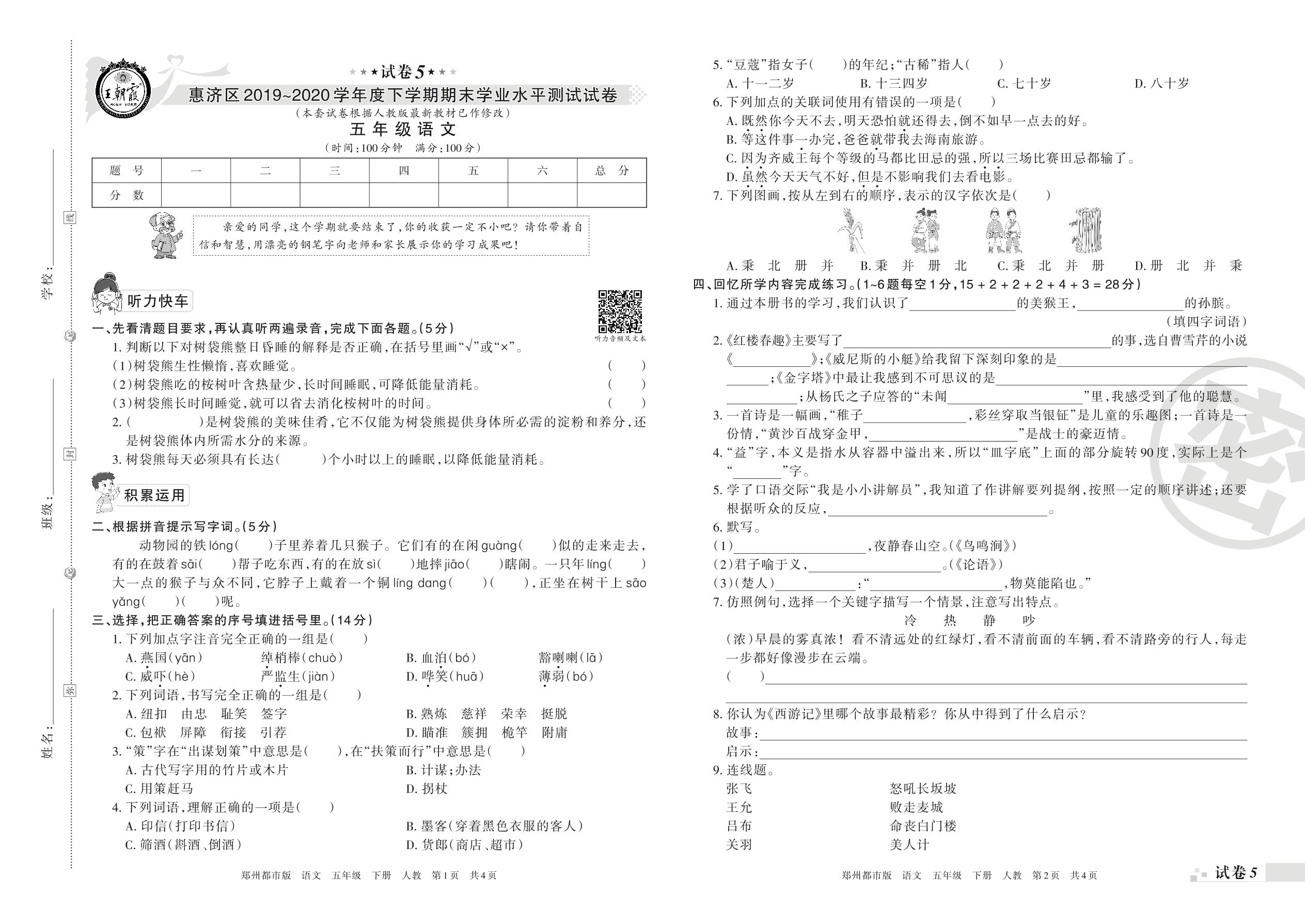 2019-2020学年第二学期郑州市惠济区五年级语文试卷(人教版)【5】