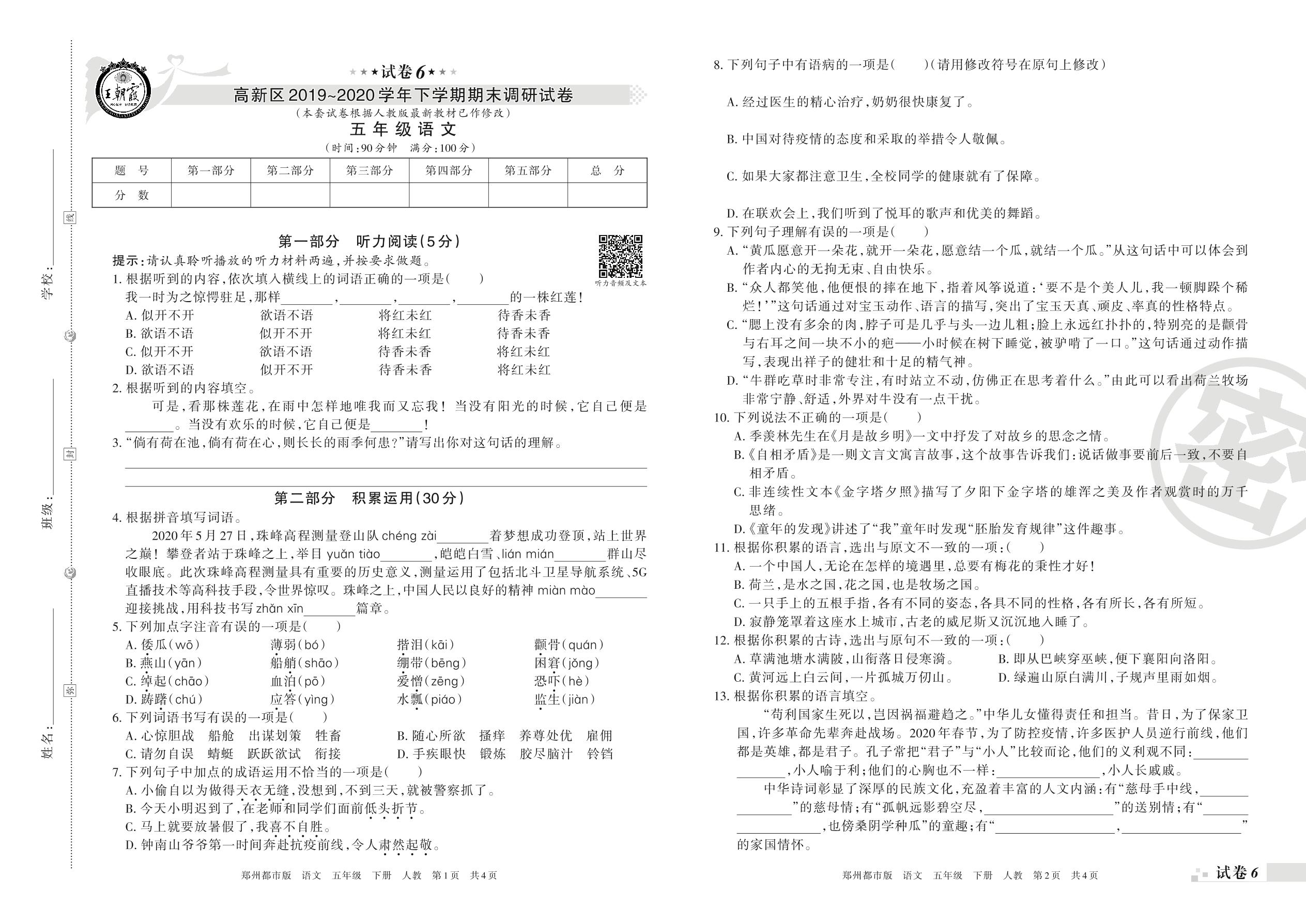 2019-2020学年第二学期郑州市高新区五年级语文试卷(人教版)【6】