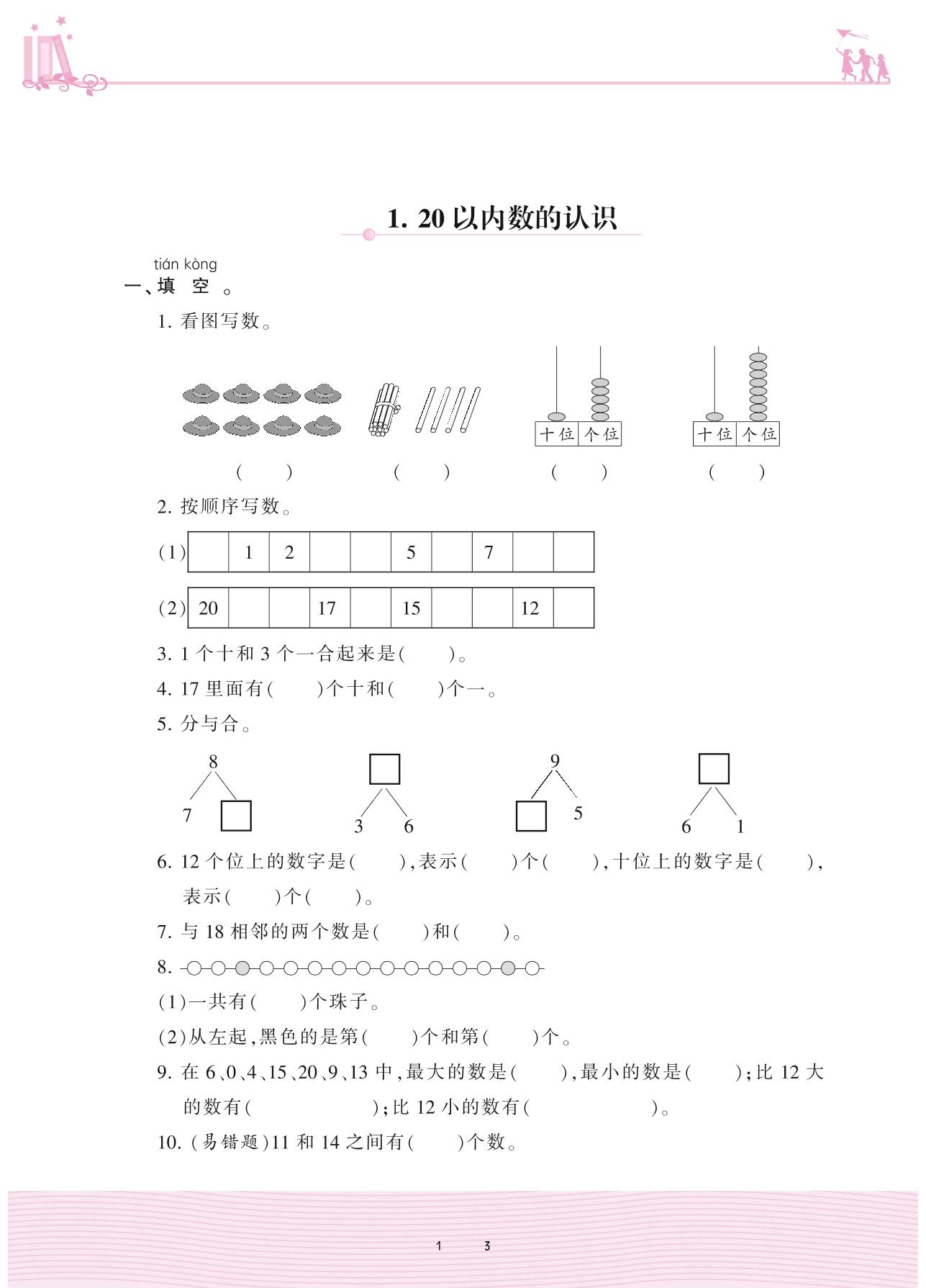 2020上册一年级数学冀教版 整理与评价——1. 20以内数的认识