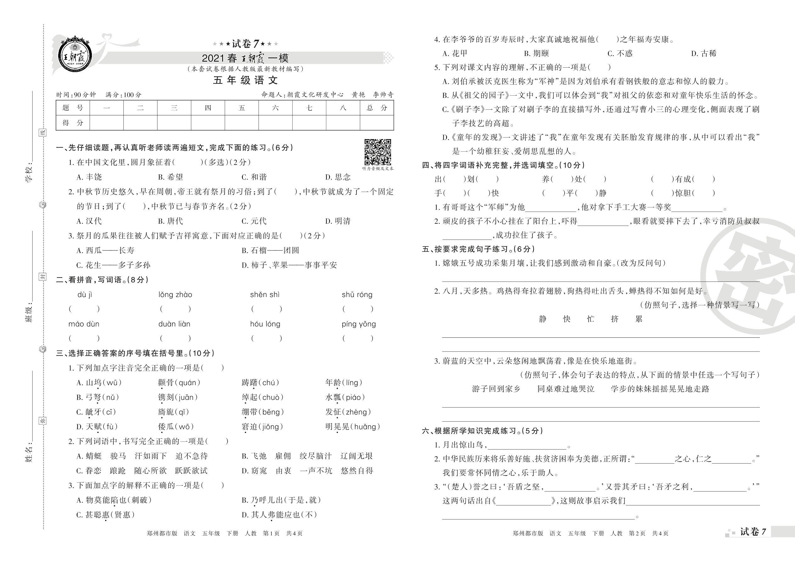 王朝霞期末模拟卷五年级下册语文(人教版)_R210801180859【7】