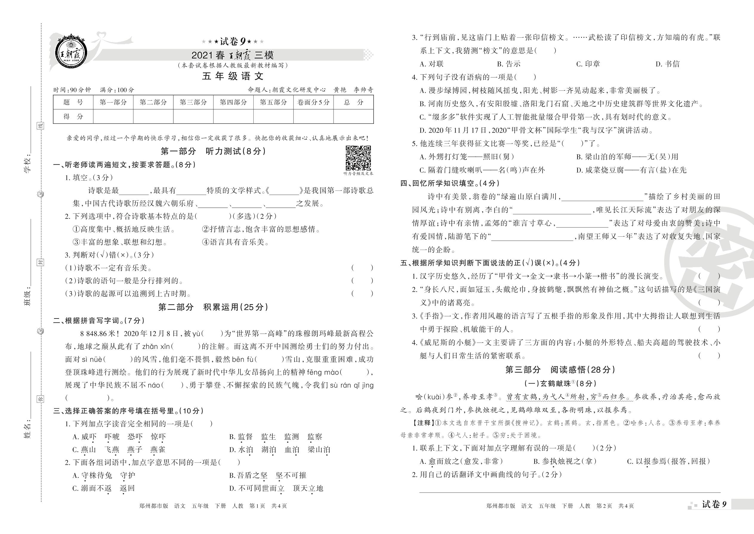 王朝霞期末模拟卷五年级下册语文(人教版)_R210801180911【9】