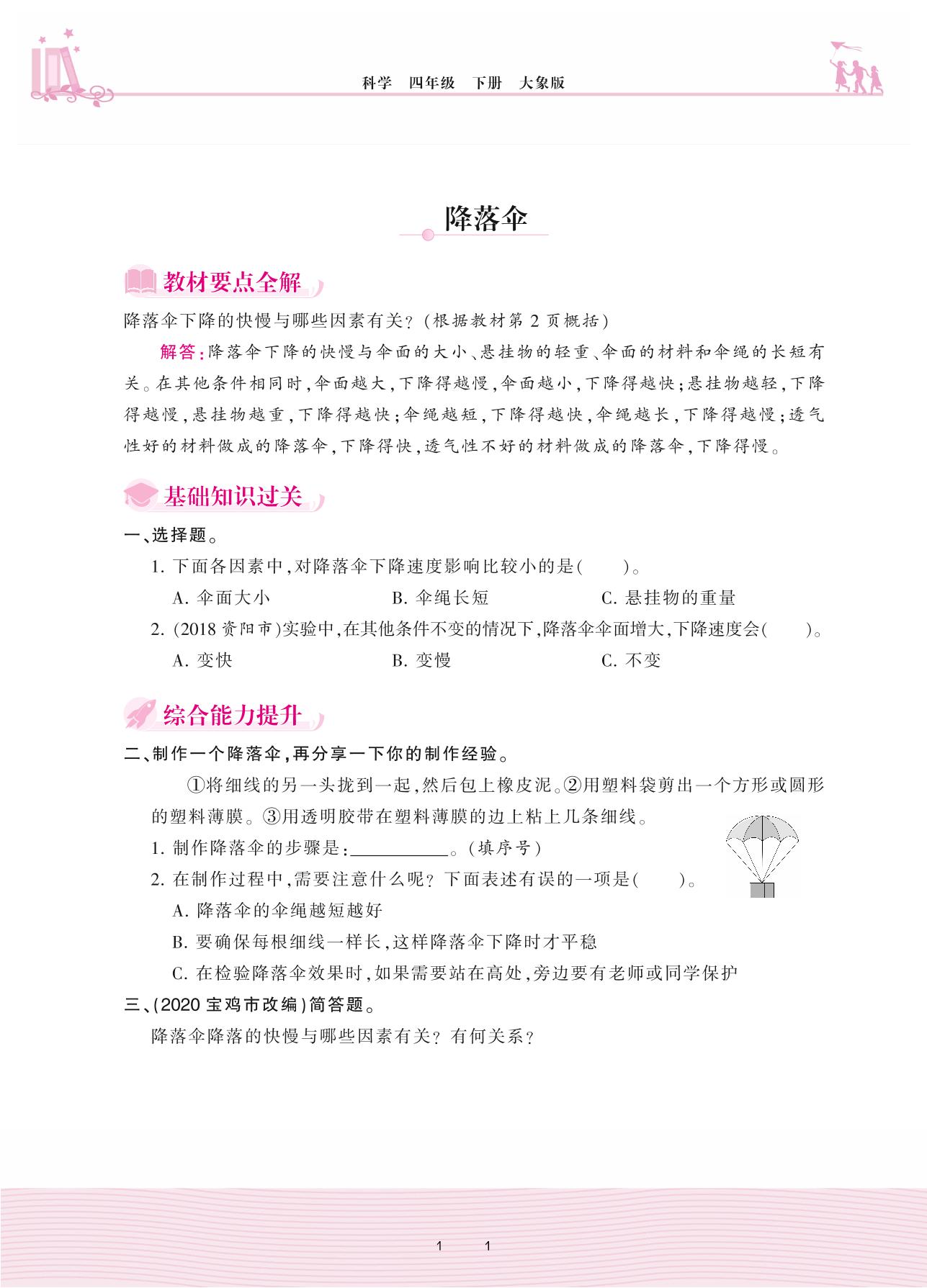 2021下册四年级科学大象版 准备单元——降落伞课时卷