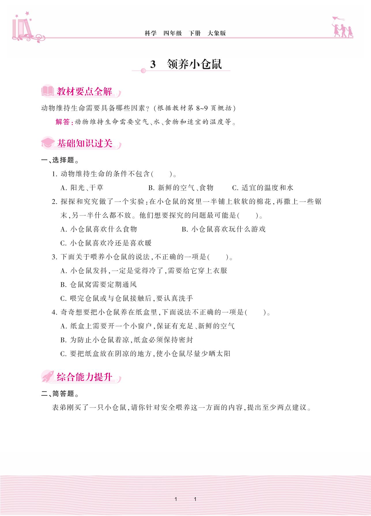 2021下册四年级科学大象版 第一单元 生命世界——3 领养小仓鼠课时卷