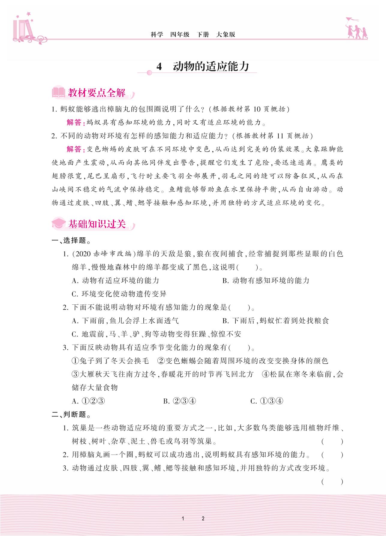 2021下册四年级科学大象版 第一单元 生命世界——4 动物的适应能力课时卷