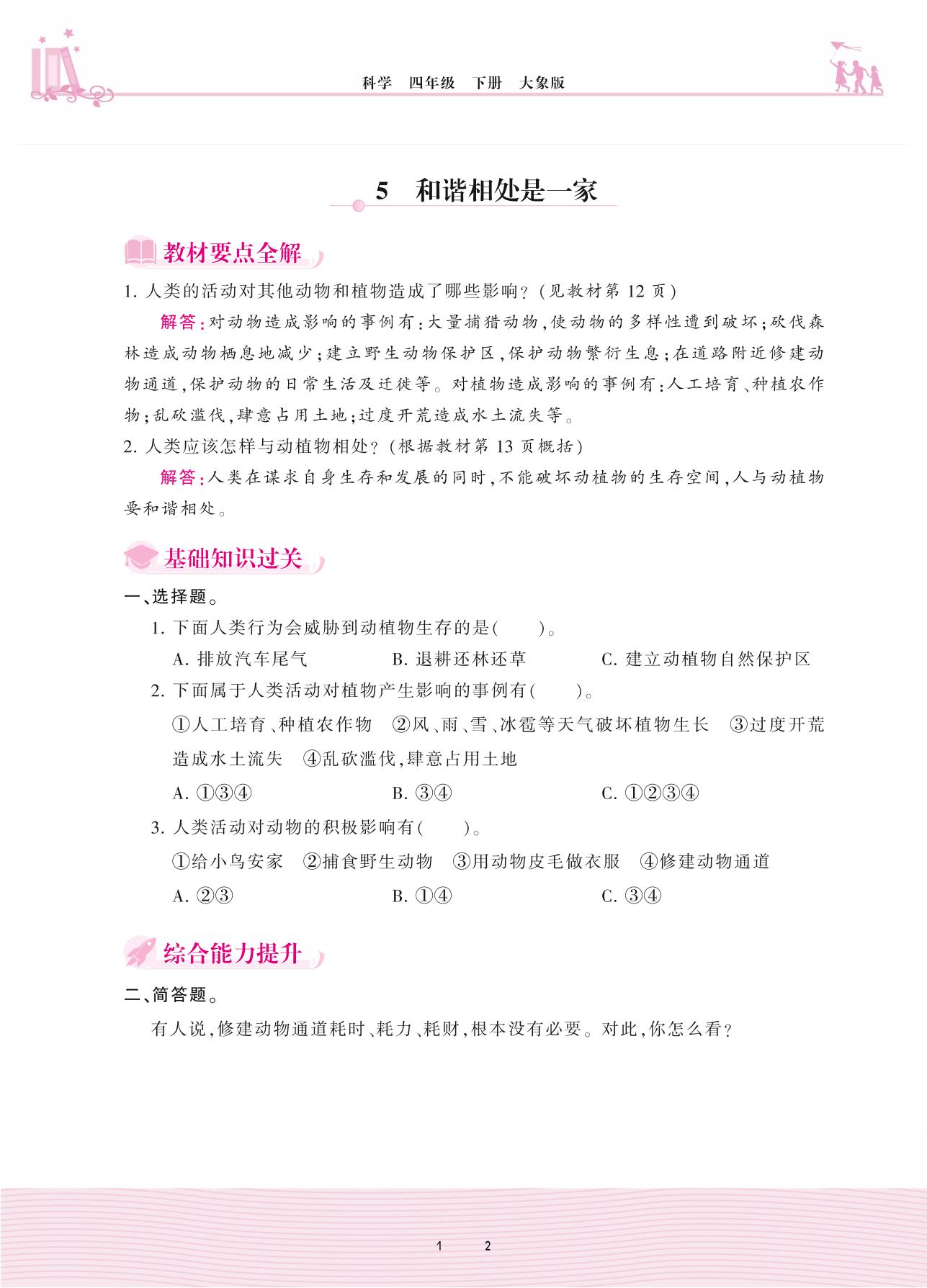 2021下册四年级科学大象版 第一单元 生命世界——5 和谐相处是一家课时卷
