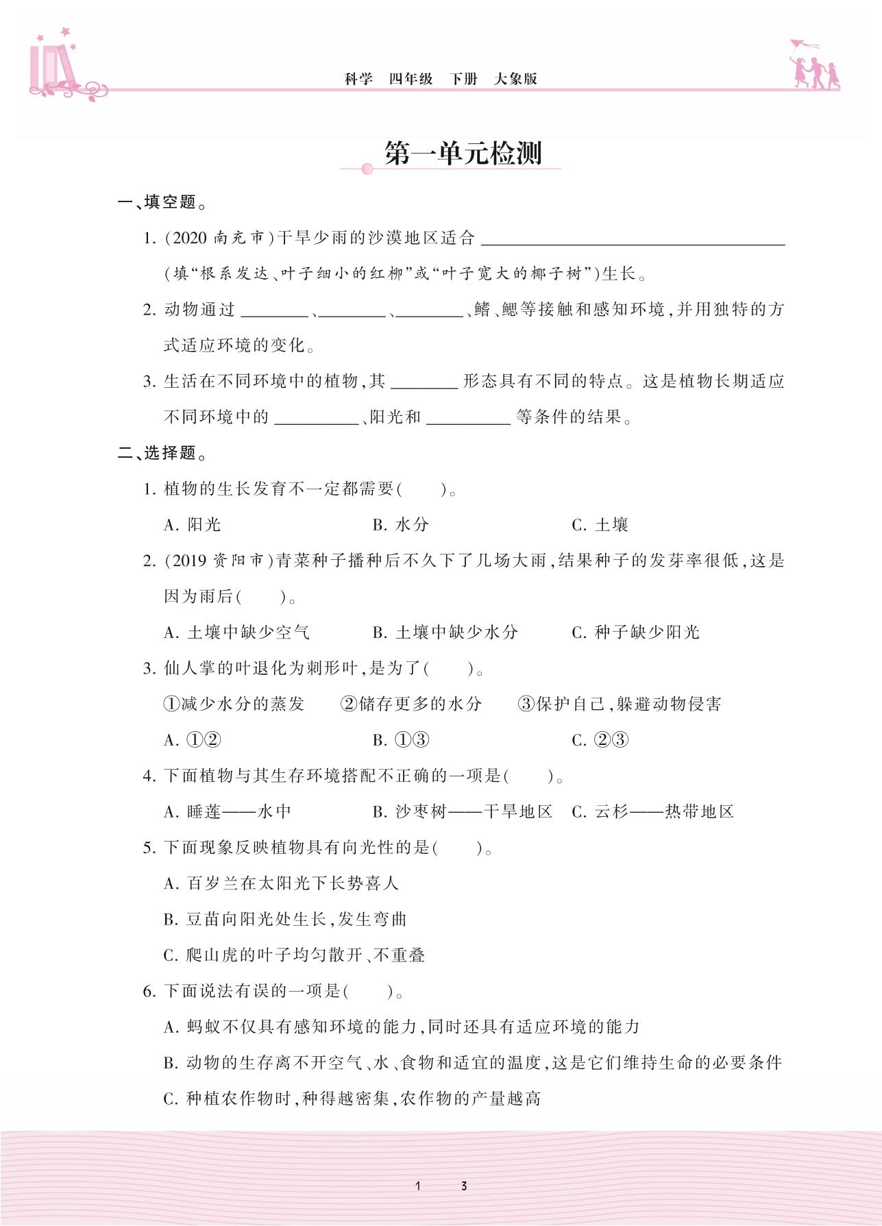 2021下册四年级科学大象版 第一单元 生命世界——第一单元检测单元卷