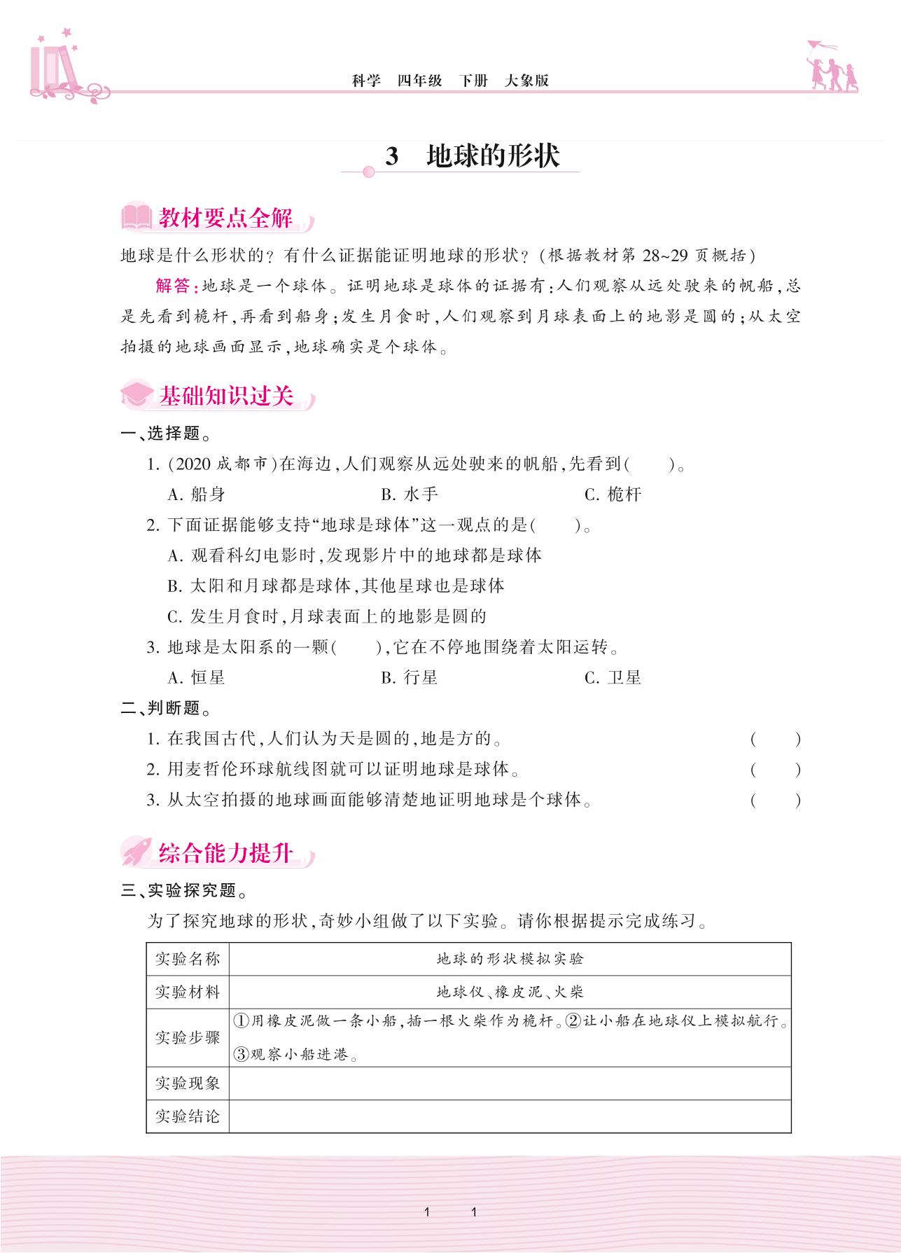 2021下册四年级科学大象版 第三单元 太阳、地球和月球——3 地球的形状课时卷