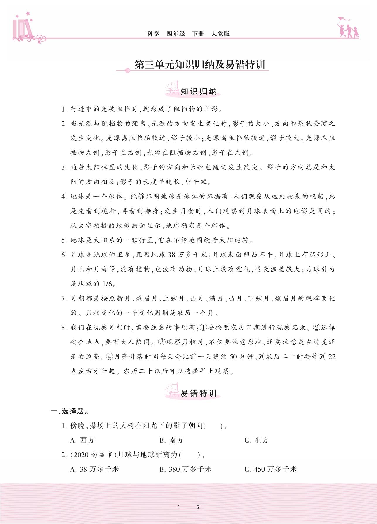 2021下册四年级科学大象版 第三单元 太阳、地球和月球——第三单元知识归纳及易错特训专项卷