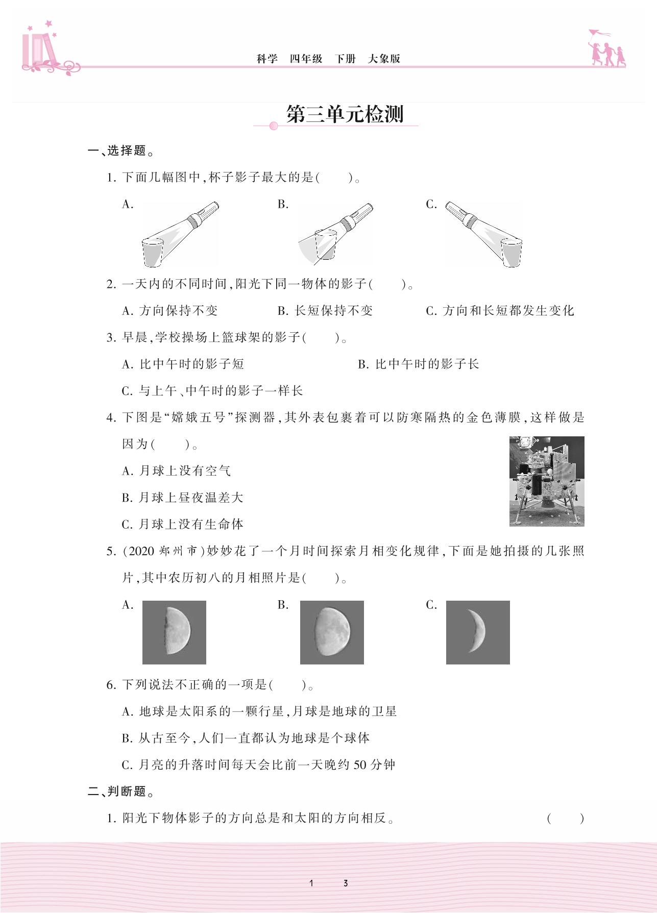 2021下册四年级科学大象版 第三单元 太阳、地球和月球——第三单元检测单元卷