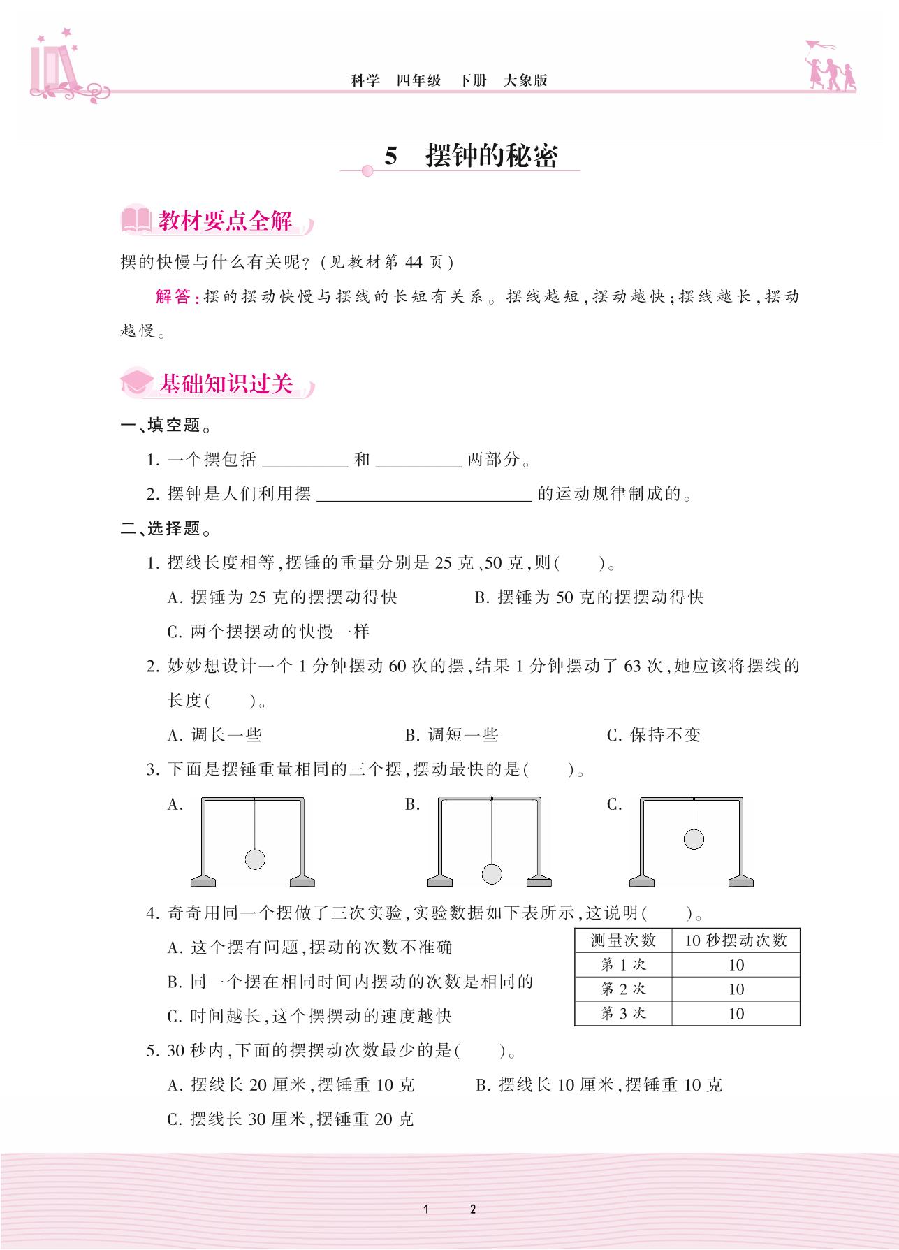 2021下册四年级科学大象版 第四单元 精确时间的步伐——5 摆钟的秘密课时卷