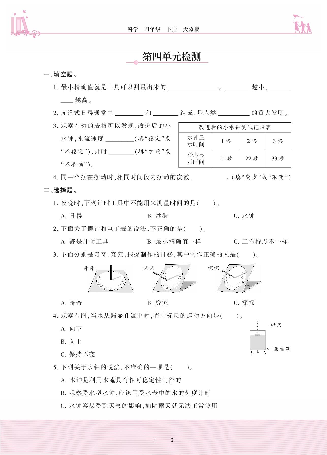 2021下册四年级科学大象版 第四单元 精确时间的步伐——第四单元检测单元卷