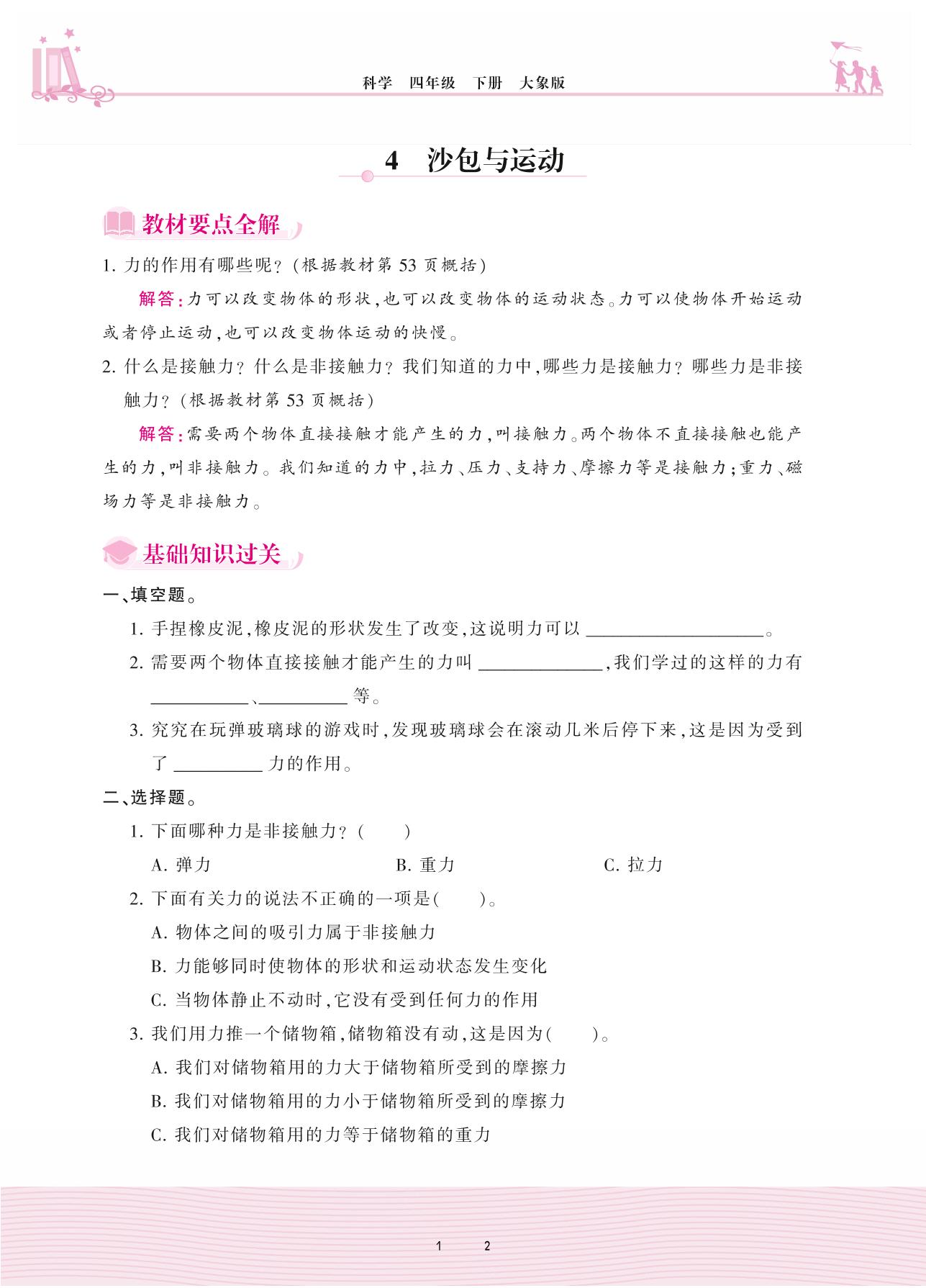 2021下册四年级科学大象版 第五单元 开心游乐场——4 沙包与运动课时卷