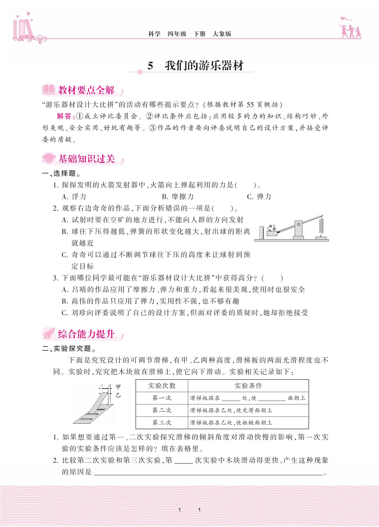 2021下册四年级科学大象版 第五单元 开心游乐场——5 我们的游乐器材课时卷