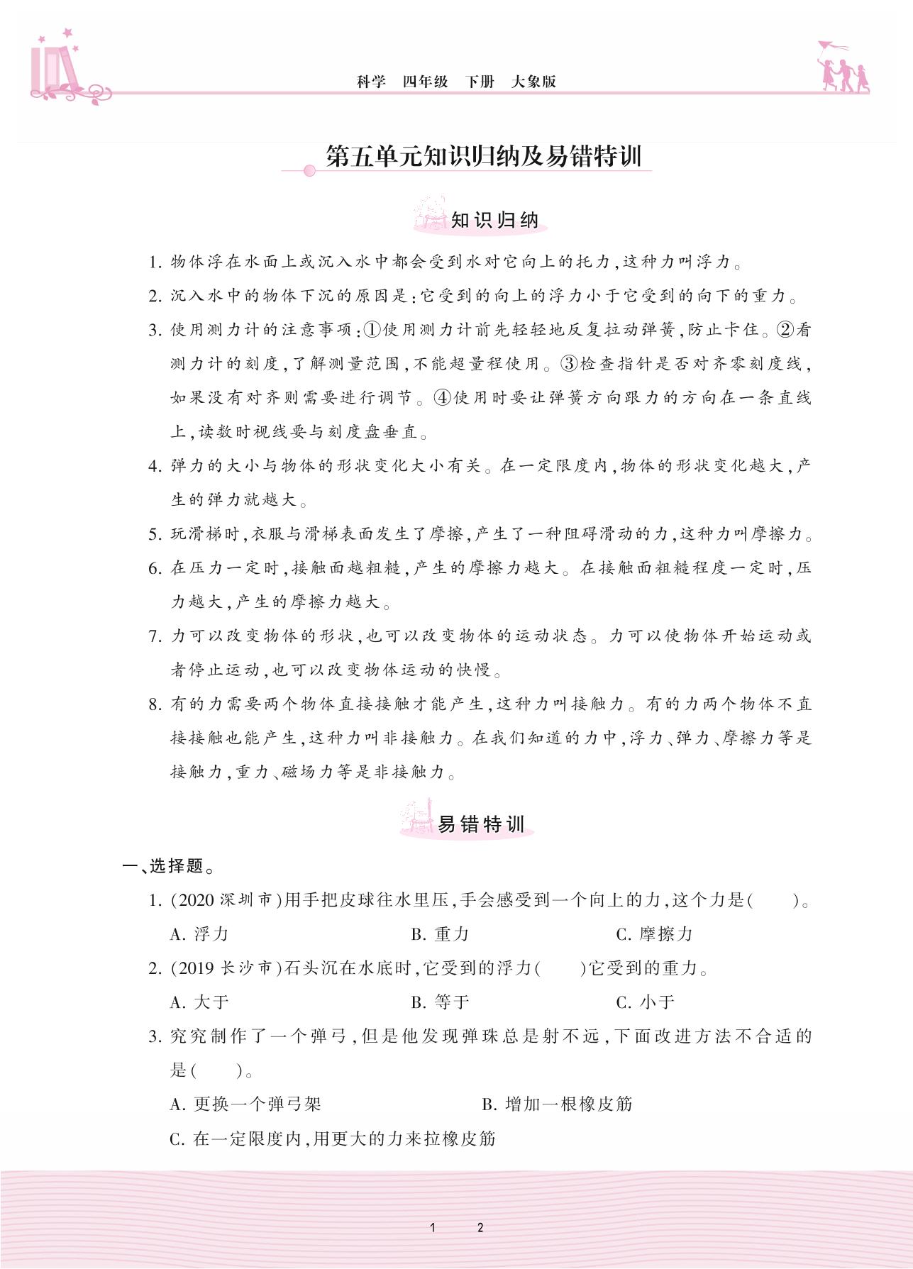 2021下册四年级科学大象版 第五单元 开心游乐场——第五单元知识归纳及易错特训专项卷