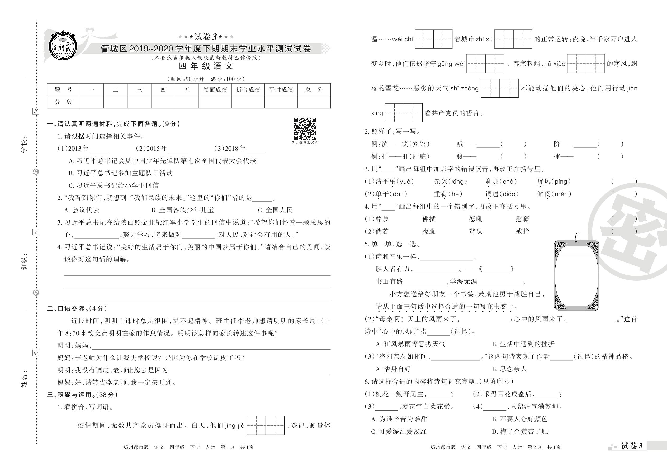 2019-2020学年第二学期郑州市管城区四年级语文试卷(人教版)【3】