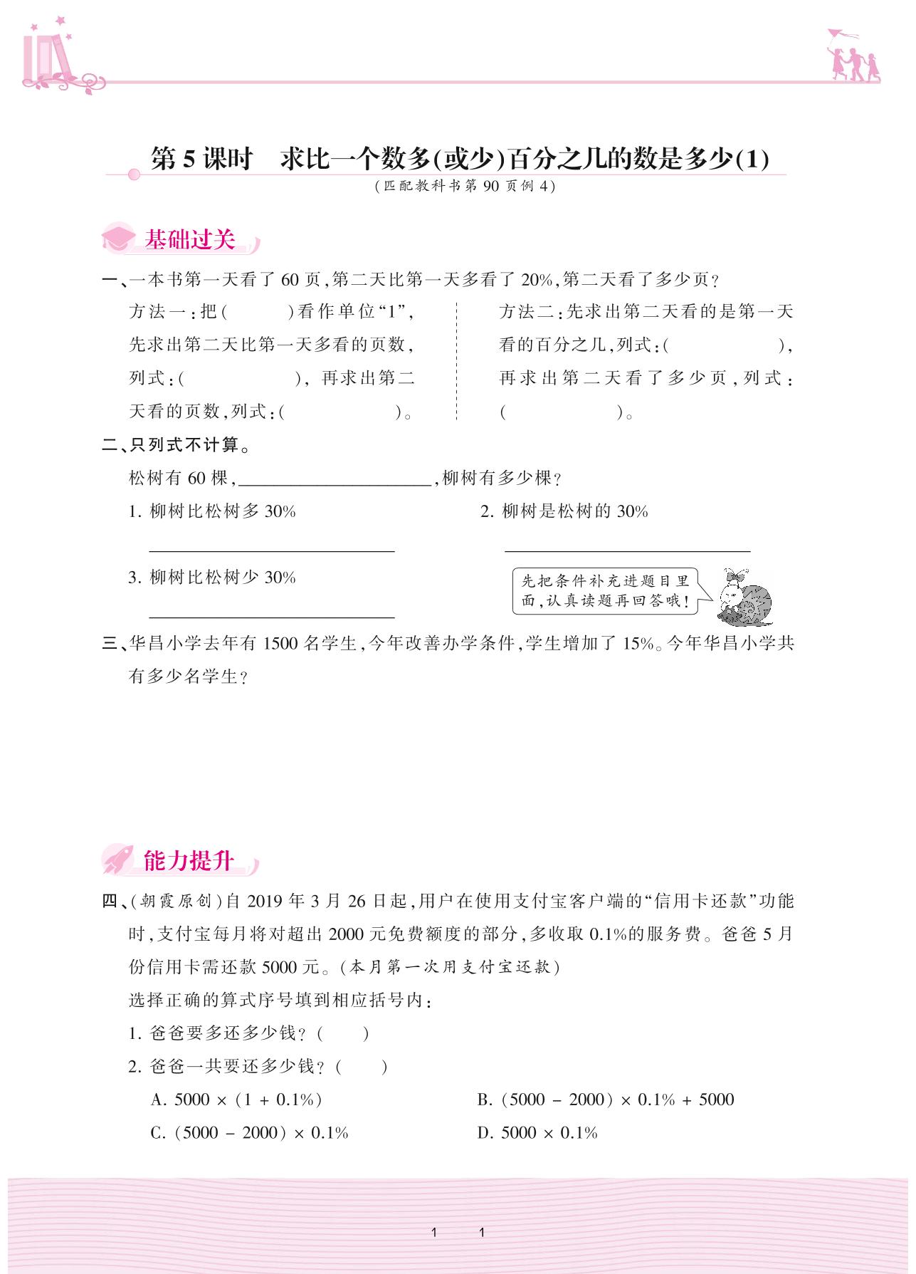 2020上册六年级数学人教版 6 百分数(一)——第5课时 求比一个数多(或少)百分之几的数是多少(1)