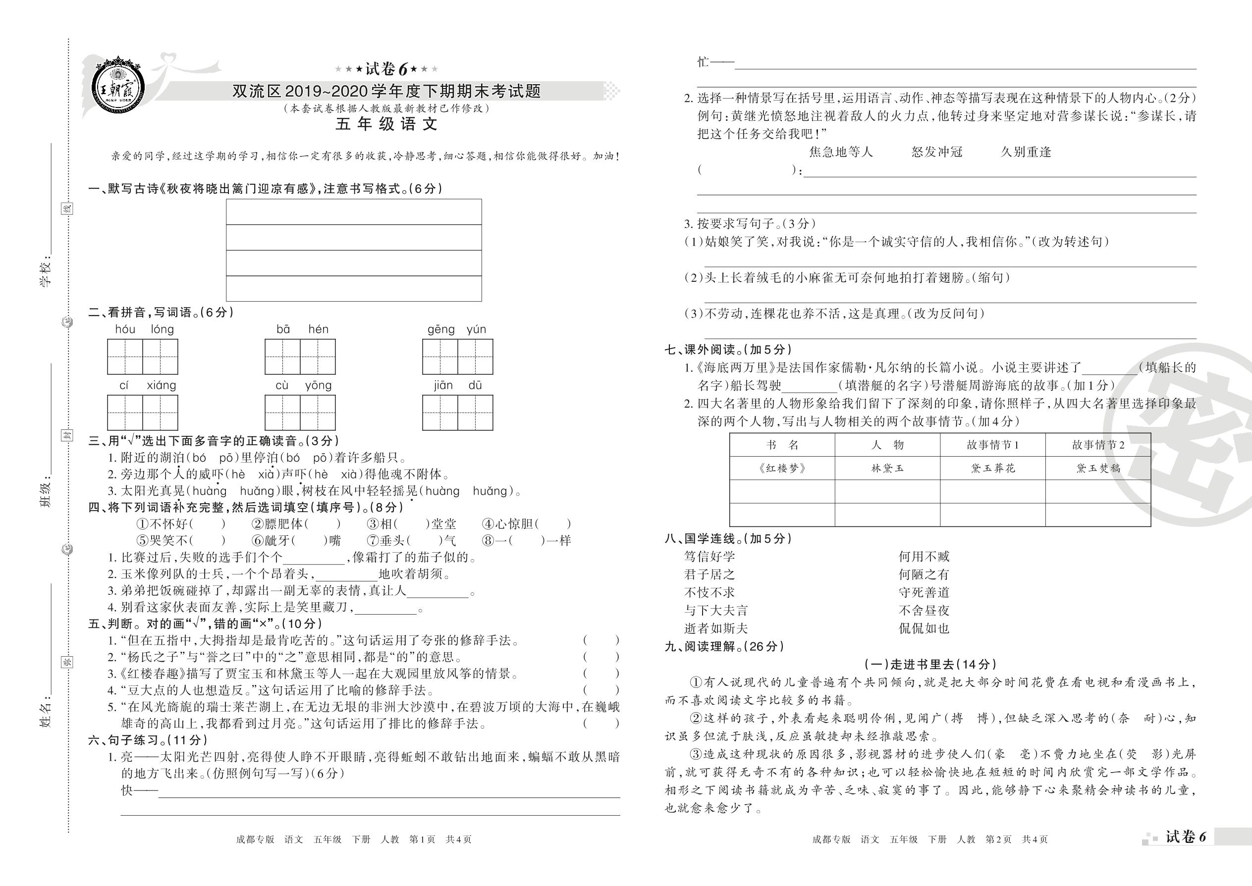 2019-2020学年第二学期成都市双流区五年级语文试卷(人教版)【6】