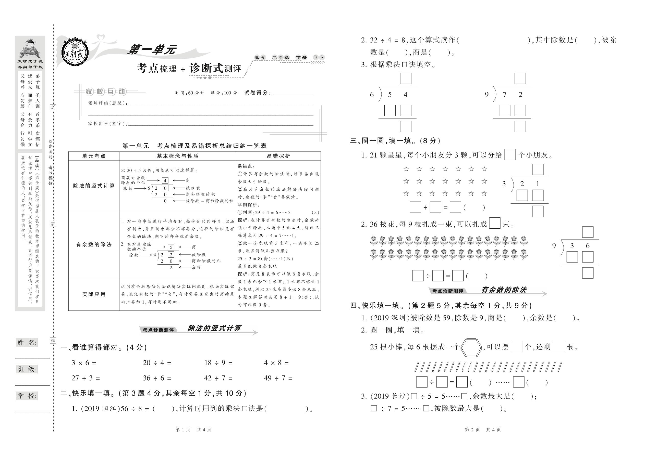 2021下册二年级数学北师版 第一单元 考点梳理+诊断式测评