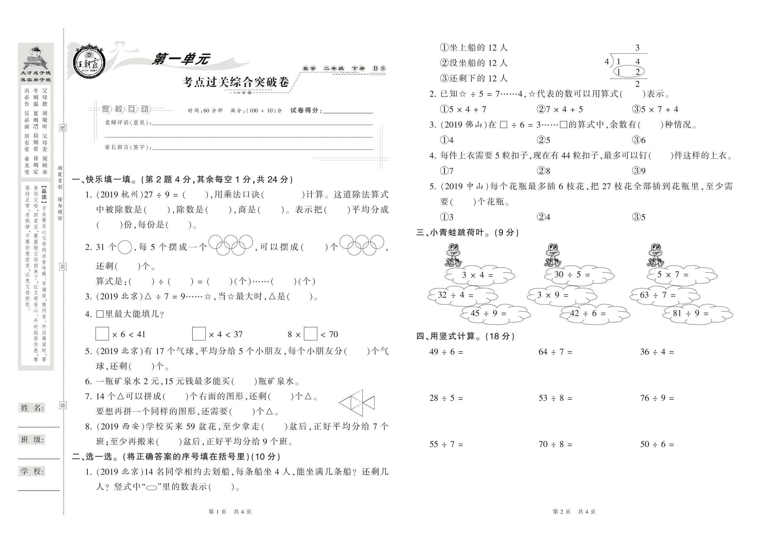 2021下册二年级数学北师版 第一单元 考点过关综合突破卷
