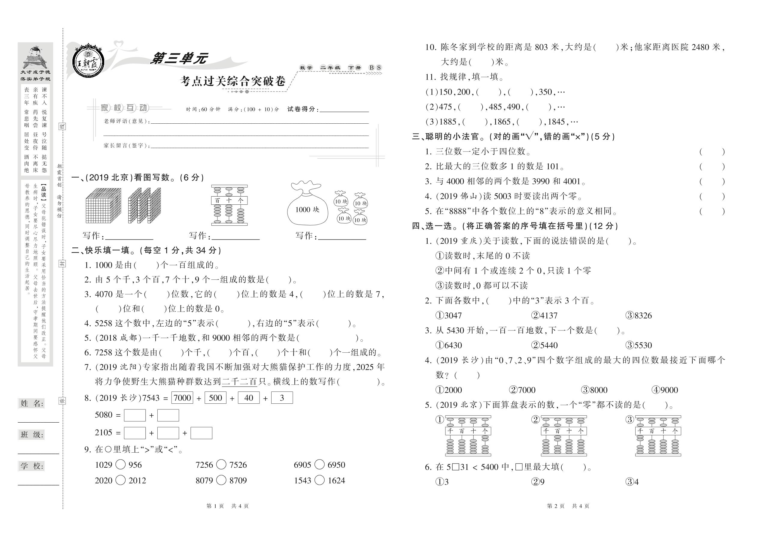2021下册二年级数学北师版 第三单元 考点过关综合突破卷