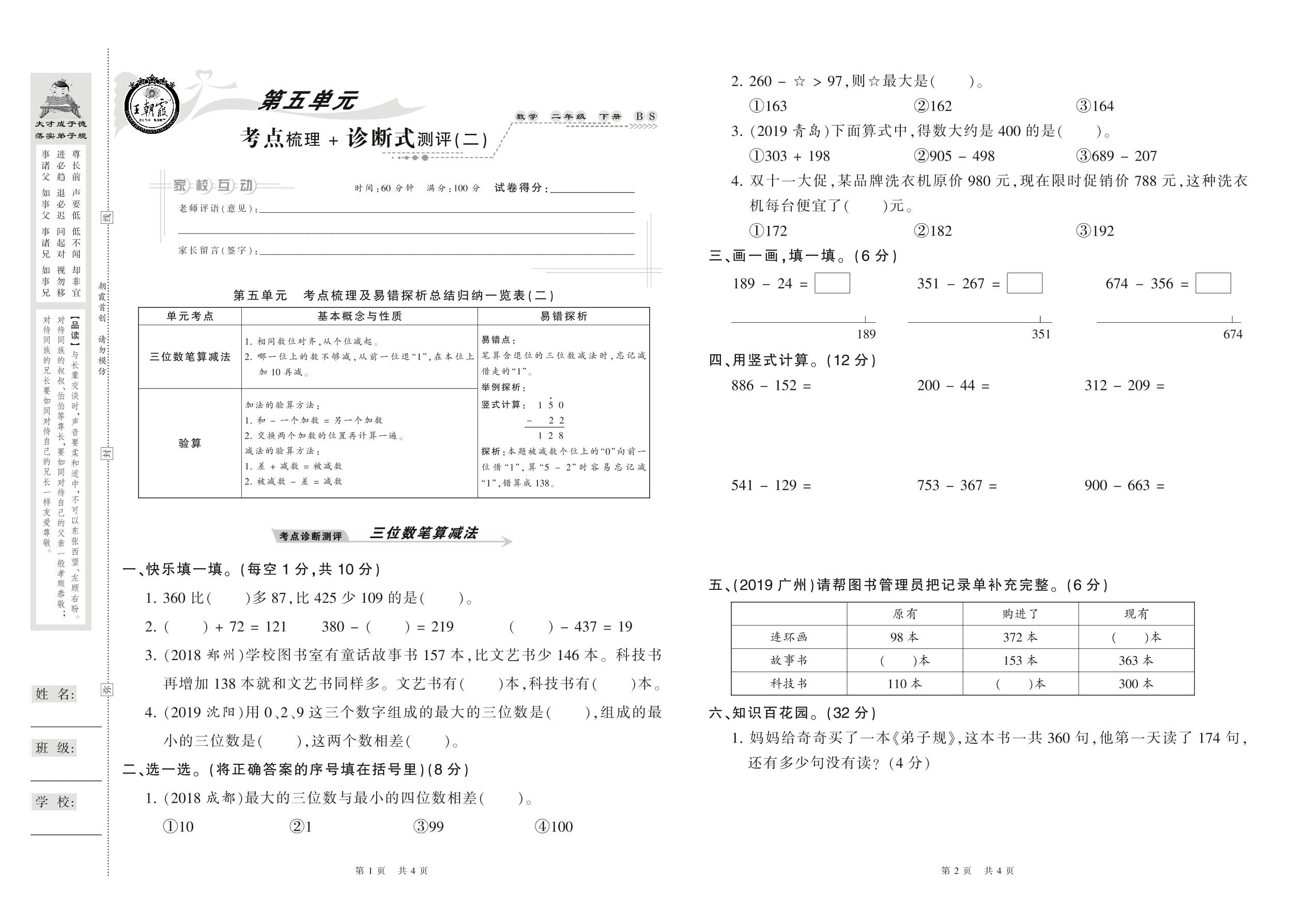 2021下册二年级数学北师版 第五单元 考点梳理+诊断式测评(二)